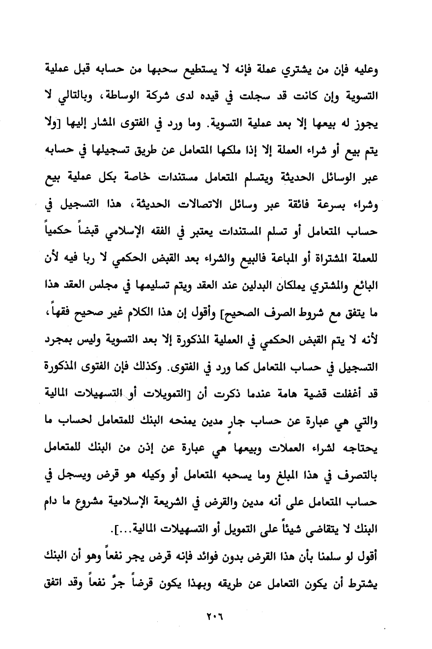 وعليه فإن من يشتري عملة فإنه لا يستطيع سحبها من حسابه قبل عملية التسوية وإن كانت قد سجلت في قيده لدى شركة الوساطة، وبالتالي لا يجوز له بيعها إلا بعد عملية التسوية. وما ورد في الفتوى المشار إليها [ولا يتم بيع أو شراء العملة إلا إذا ملكها المتعامل عن طريق تسجيلها في حسابه عبر الوسائل الحديثة ويتسلم المتعامل مستندات خاصة بكل عملية بيع وشراء بسرعة فائقة عبر وسائل الاتصالات الحديثة، هذا التسجيل في حساب المتعامل أو تسلم المستندات يعتبر في الفقه الإسلامي قبضاً حكمياً للعملة المشتراة أو المباعة فالبيع والشراء بعد القبض الحكمي لا ربا فيه لأن البائع والمشتري يملكان البدلين عند العقد ويتم تسليمها في مجلس العقد هذا ما يتفق مع شروط الصرف الصحيح] وأقول إن هذا الكلام غير صحيح فقهاً، لأنه لا يتم القبض الحكمي في العملية المذكورة إلا بعد التسوية وليس بمجرد التسجيل في حساب المتعامل كما ورد في الفتوى. وكذلك فإن الفتوى المذكورة قد أغفلت قضية هامة عندما ذكرت أن [التمويلات أو التسهيلات المالية والتي هي عبارة عن حساب جارٍ مدين يمنحه البنك للمتعامل لحساب ما يحتاجه لشراء العملات وبيعها هي عبارة عن إذن من البنك للمتعامل بالتصرف في هذا المبلغ وما يسحبه المتعامل أو وكيله هو قرض ويسجل في حساب المتعامل على أنه مدين والقرض في الشريعة الإسلامية مشروع ما دام البنك لا يتقاضى شيئاً على التمويل أو التسهيلات المالية ... ].