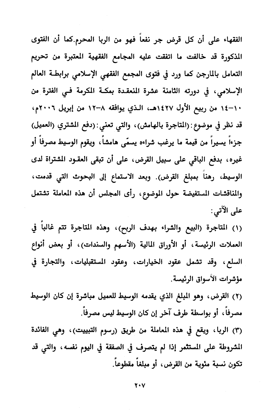 الفقهاء على أن كل قرض جر نفعاً فهو من الربا المحرم. كما أن الفتوى المذكورة قد خالفت ما اتفقت عليه المجامع الفقهية المعتبرة من تحريم التعامل بالمارجن كما ورد في فتوى المجمع الفقهي الإسلامي برابطة العالم الإسلامي، في دورته الثامنة عشرة المنعقدة بمكة المكرمة في الفترة من 10 - 14 من ربيع الأول 1427هـ، الذي يوافقه 8 - 12 من إبريل 2006م، قد نظر في موضوع: (المتاجرة بالهامش)، والتي تعني: (دفع المشتري (العميل) جزءاً يسيراً من قيمة ما يرغب شراءه يسمّى هامشاً، ويقوم الوسيط مصرفاً أو غيره، بدفع الباقي على سبيل القرض، على أن تبقى العقود المشتراة لدى الوسيط، رهناً بمبلغ القرض). وبعد الاستماع إلى البحوث التي قدمت، والمناقشات المستفيضة حول الموضوع، رأى المجلس أن هذه المعاملة تشتمل على الآتي: