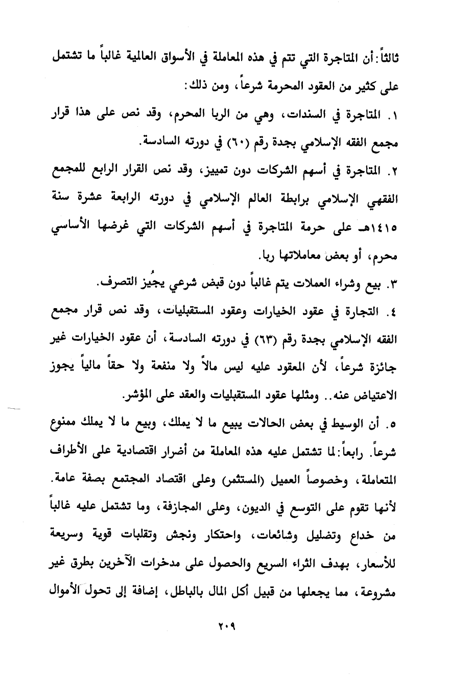 4. التجارة في عقود الخيارات وعقود المستقبليات، وقد نص قرار مجمع الفقه الإسلامي بجدة رقم (63) في دورته السادسة، أن عقود الخيارات غير جائزة شرعاً، لأن المعقود عليه ليس مالاً ولا منفعة ولا حقاً مالياً يجوز الاعتياض عنه .. ومثلها عقود المستقبليات والعقد على المؤشر.