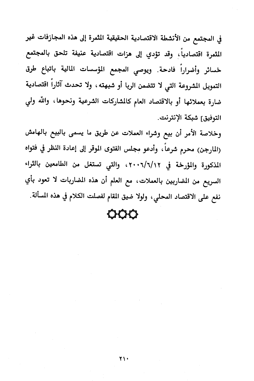 في المجتمع من الأنشطة الاقتصادية الحقيقية المثمرة إلى هذه المجازفات غير المثمرة اقتصادياً، وقد تؤدي إلى هزات اقتصادية عنيفة تلحق بالمجتمع خسائر وأضراراً فادحة. ويوصي المجمع المؤسسات المالية باتباع طرق التمويل المشروعة التي لا تتضمن الربا أو شبهته، ولا تحدث آثاراً اقتصادية ضارة بعملائها أو بالاقتصاد العام كالمشاركات الشرعية ونحوها، والله ولي التوفيق] شبكة الإنترنت.