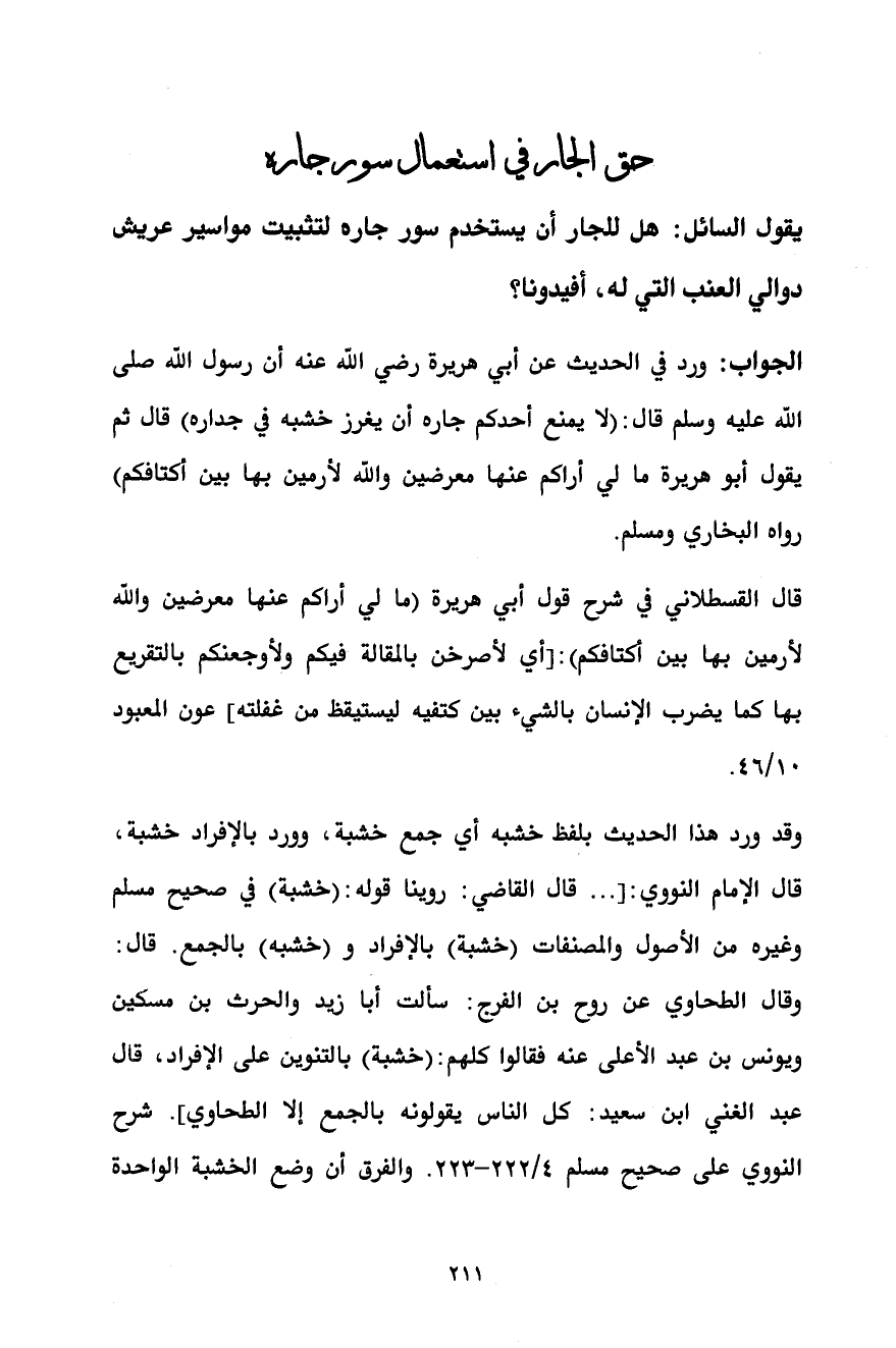 الجواب: ورد في الحديث عن أبي هريرة رضي الله عنه أن رسول الله صلى الله عليه وسلم قال: (لا يمنع أحدكم جاره أن يغرز خشبه في جداره) قال ثم يقول أبو هريرة ما لي أراكم عنها معرضين والله لأرمين بها بين أكتافكم) رواه البخاري ومسلم.