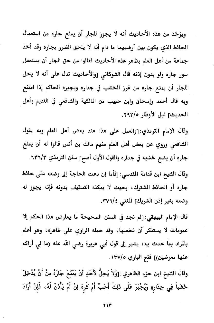 وقال الشيخ ابن حزم الظاهري: [وَلاَ يَحِلُّ لأََحَدٍ أَنْ يَمْنَعَ جَارَهُ مِنْ أَنْ يُدْخِلَ خَشَباً فِي جِدَارِهِ وَيُجْبَرَ عَلَى ذَلِكَ أَحَبَّ أَمْ كَرِهَ إنْ لَمْ يَأْذَنْ لَهُ، فَإِنْ أَرَادَ