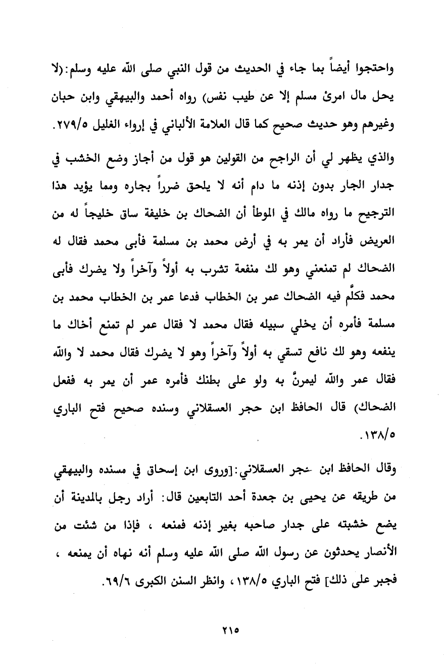 وقال الحافظ ابن حجر العسقلاني: [وروى ابن إسحاق في مسنده والبيهقي من طريقه عن يحيى بن جعدة أحد التابعين قال: أراد رجل بالمدينة أن يضع خشبته على جدار صاحبه بغير إذنه فمنعه، فإذا من شئت من الأنصار يحدثون عن رسول الله صلى الله عليه وسلم أنه نهاه أن يمنعه، فجبر على ذلك] فتح الباري 5/ 138، وانظر السنن الكبرى 6/ 69.
