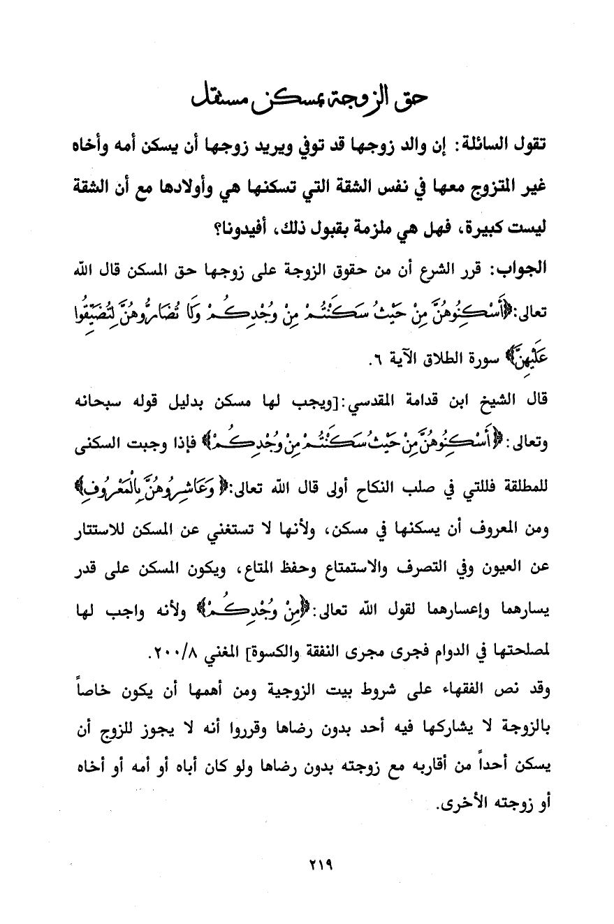 وقد نص الفقهاء على شروط بيت الزوجية ومن أهمها أن يكون خاصاً بالزوجة لا يشاركها فيه أحد بدون رضاها وقرروا أنه لا يجوز للزوج أن يسكن أحداً من أقاربه مع زوجته بدون رضاها ولو كان أباه أو أمه أو أخاه أو زوجته الأخرى.