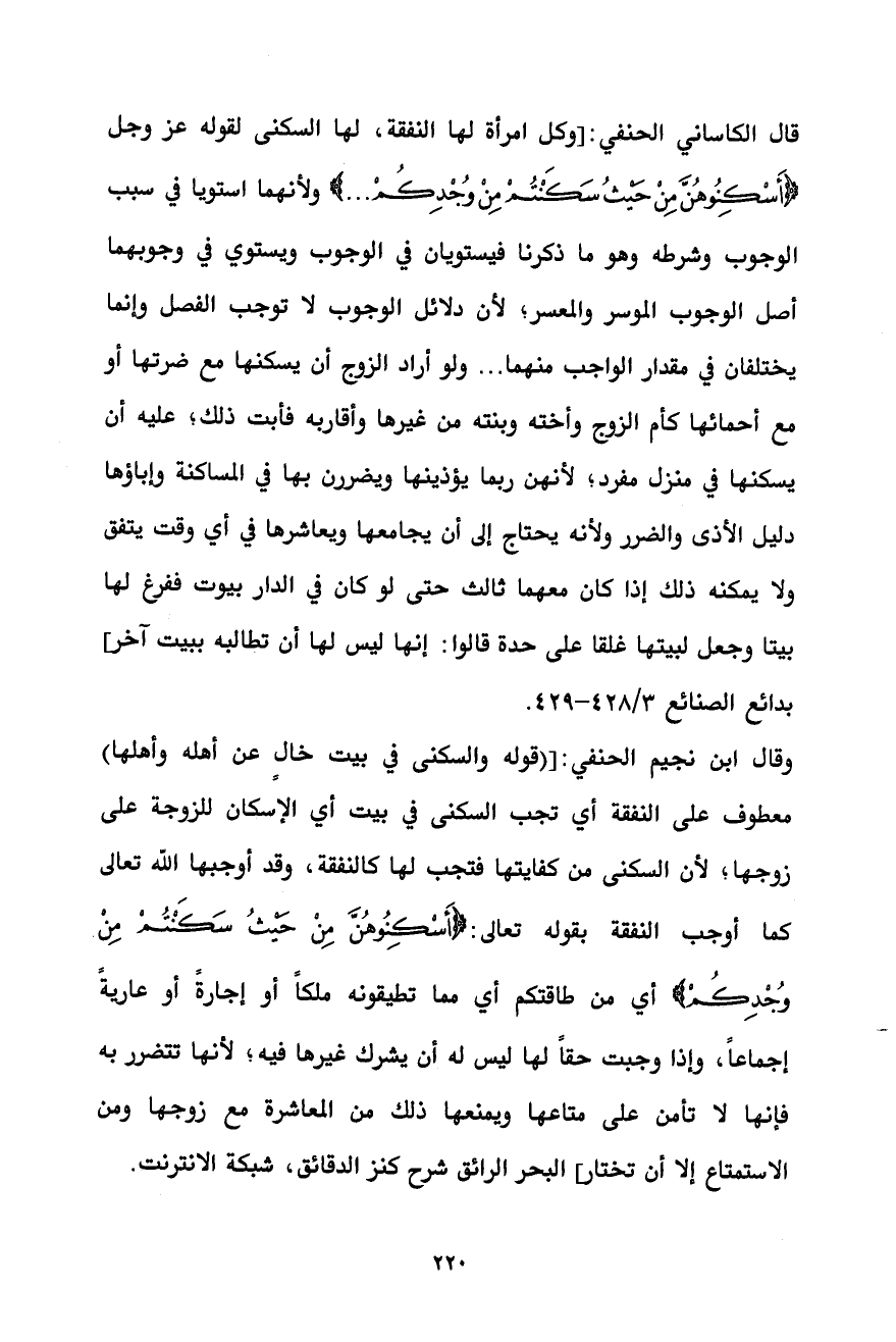 وقال ابن نجيم الحنفي: [(قوله والسكنى في بيت خالٍ عن أهله وأهلها) معطوف على النفقة أي تجب السكنى في بيت أي الإسكان للزوجة على زوجها؛ لأن السكنى من كفايتها فتجب لها كالنفقة، وقد أوجبها الله تعالى كما أوجب النفقة بقوله تعالى: {أَسْكِنُوهُنَّ مِنْ حَيْثُ سَكَنْتُمْ مِنْ وُجْدِكُمْ} أي من طاقتكم أي مما تطيقونه ملكاً أو إجارةً أو عاريةً إجماعاً، وإذا وجبت حقاً لها ليس له أن يشرك غيرها فيه؛ لأنها تتضرر به فإنها لا تأمن على متاعها ويمنعها ذلك من المعاشرة مع زوجها ومن الاستمتاع إلا أن تختار] البحر الرائق شرح كنز الدقائق، شبكة الانترنت.