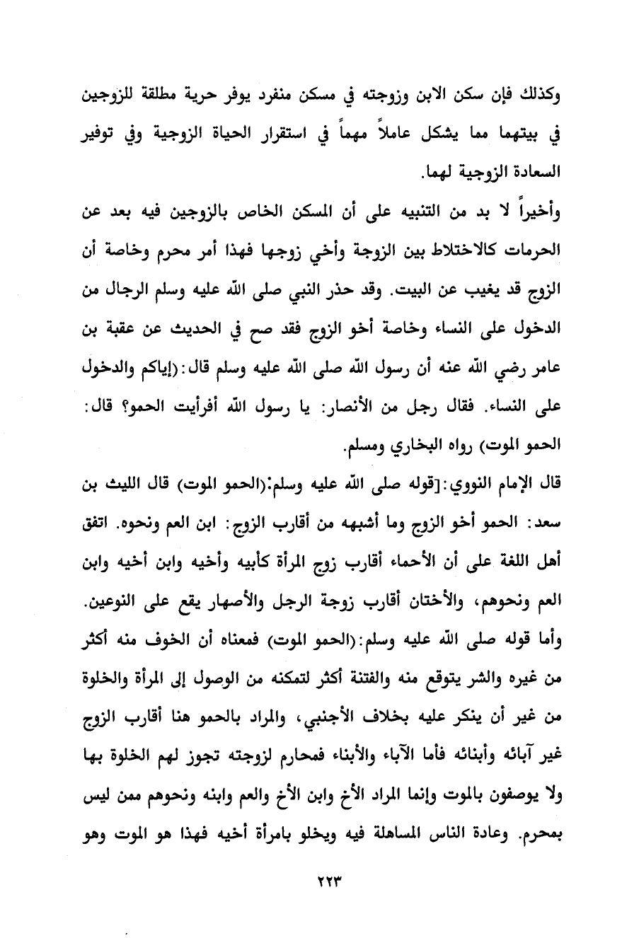 وأخيراً لا بد من التنبيه على أن المسكن الخاص بالزوجين فيه بعد عن الحرمات كالاختلاط بين الزوجة وأخي زوجها فهذا أمر محرم وخاصة أن الزوج قد يغيب عن البيت. وقد حذر النبي صلى الله عليه وسلم الرجال من الدخول على النساء وخاصة أخو الزوج فقد صح في الحديث عن عقبة بن عامر رضي الله عنه أن رسول الله صلى الله عليه وسلم قال: (إياكم والدخول على النساء. فقال رجل من الأنصار: يا رسول الله أفرأيت الحمو؟ قال: الحمو الموت) رواه البخاري ومسلم.