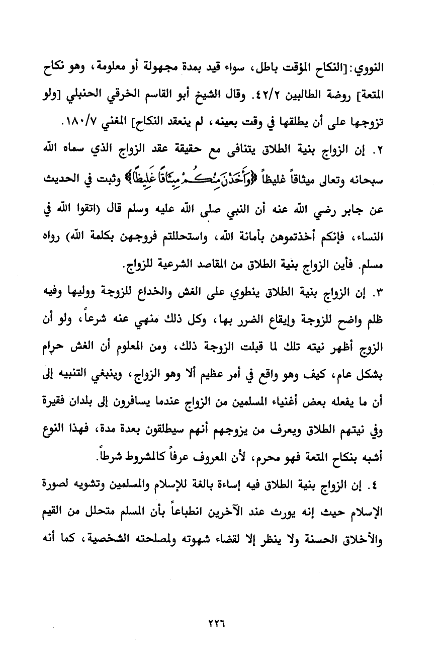 النووي: [النكاح المؤقت باطل، سواء قيد بمدة مجهولة أو معلومة، وهو نكاح المتعة] روضة الطالبين 2/ 42. وقال الشيخ أبو القاسم الخرقي الحنبلي [ولو تزوجها على أن يطلقها في وقت بعينه، لم ينعقد النكاح] المغني 7/ 180.