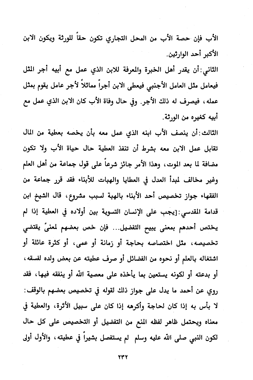 الثالث: أن ينصف الأب ابنه الذي عمل معه بأن يخصه بعطية من المال تقابل عمل الابن معه بشرط أن تنفذ العطية حال حياة الأب ولا تكون مضافة لما بعد الموت، وهذا الأمر جائز شرعاً على قول جماعة من أهل العلم وغير مخالف لمبدأ العدل في العطايا والهبات للأبناء فقد قرر جماعة من الفقهاء جواز تخصيص أحد الأبناء بالهبة لسبب مشروع، قال الشيخ ابن قدامة المقدسي: [يجب على الإنسان التسوية بين أولاده في العطية إذا لم يختص أحدهم بمعنى يبيح التفضيل ... فإن خص بعضهم لمعنىً يقتضي تخصيصه، مثل اختصاصه بحاجة أو زمانة أو عمى، أو كثرة عائلة أو اشتغاله بالعلم أو نحوه من الفضائل أو صرف عطيته عن بعض ولده لفسقه، أو بدعته أو لكونه يستعين بما يأخذه على معصية الله أو ينفقه فيها، فقد روي عن أحمد ما يدل على جواز ذلك لقوله في تخصيص بعضهم بالوقف: لا بأس به إذا كان لحاجة وأكرهه إذا كان على سبيل الأثرة، والعطية في معناه ويحتمل ظاهر لفظه المنع من التفضيل أو التخصيص على كل حال لكون النبي صلى الله عليه وسلم لم يستفصل بشيراً في عطيته، والأول أولى