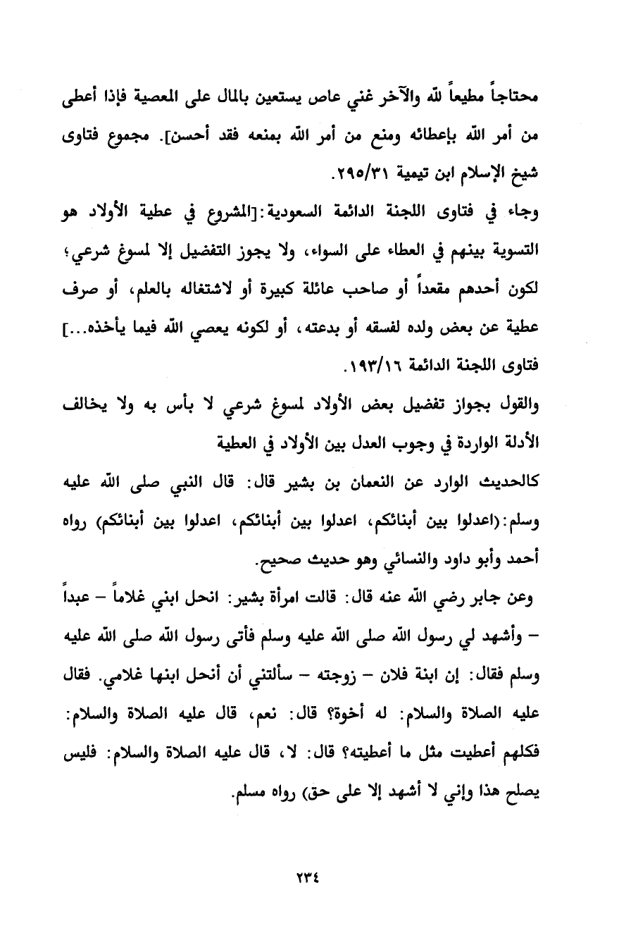 وجاء في فتاوى اللجنة الدائمة السعودية: [المشروع في عطية الأولاد هو التسوية بينهم في العطاء على السواء، ولا يجوز التفضيل إلا لمسوغ شرعي؛ لكون أحدهم مقعداً أو صاحب عائلة كبيرة أو لاشتغاله بالعلم، أو صرف عطية عن بعض ولده لفسقه أو بدعته، أو لكونه يعصي الله فيما يأخذه ... ] فتاوى اللجنة الدائمة 16/ 193.