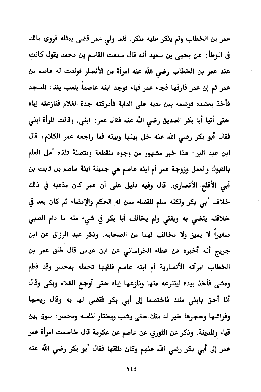 عمر بن الخطاب ولم ينكر عليه منكر. فلما ولي عمر قضى بمثله فروى مالك في الموطأ: عن يحيى بن سعيد أنه قال سمعت القاسم بن محمد يقول كانت عند عمر بن الخطاب رضي الله عنه امرأة من الأنصار فولدت له عاصم بن عمر ثم إن عمر فارقها فجاء عمر قباء فوجد ابنه عاصماً يلعب بفناء المسجد فأخذ بعضده فوضعه بين يديه على الدابة فأدركته جدة الغلام فنازعته إياه حتى أتيا أبا بكر الصديق رضي الله عنه فقال عمر: ابني. وقالت المرأة ابني فقال أبو بكر رضي الله عنه خل بينها وبينه فما راجعه عمر الكلام، قال ابن عبد البر: هذا خبر مشهور من وجوه منقطعة ومتصلة تلقاه أهل العلم بالقبول والعمل وزوجة عمر أم ابنه عاصم هي جميلة ابنة عاصم بن ثابت بن أبي الأقلح الأنصاري. قال وفيه دليل على أن عمر كان مذهبه في ذلك خلاف أبي بكر ولكنه سلم للقضاء ممن له الحكم والإمضاء ثم كان بعد في خلافته يقضي به ويفتي ولم يخالف أبا بكر في شيء منه ما دام الصبي صغيراً لا يميز ولا مخالف لهما من الصحابة. وذكر عبد الرزاق عن ابن جريج أنه أخبره عن عطاء الخراساني عن ابن عباس قال طلق عمر بن الخطاب امرأته الأنصارية أم ابنه عاصم فلقيها تحمله بمحسر وقد فطم ومشى فأخذ بيده لينتزعه منها ونازعها إياه حتى أوجع الغلام وبكى وقال أنا أحق بابني منك فاختصما إلى أبي بكر فقضى لها به وقال ريحها وفراشها وحجرها خير له منك حتى يشب ويختار لنفسه ومحسر: سوق بين قباء والمدينة. وذكر عن الثوري عن عاصم عن عكرمة قال خاصمت امرأة عمر عمر إلى أبي بكر رضي الله عنهم وكان طلقها فقال أبو بكر رضي الله عنه