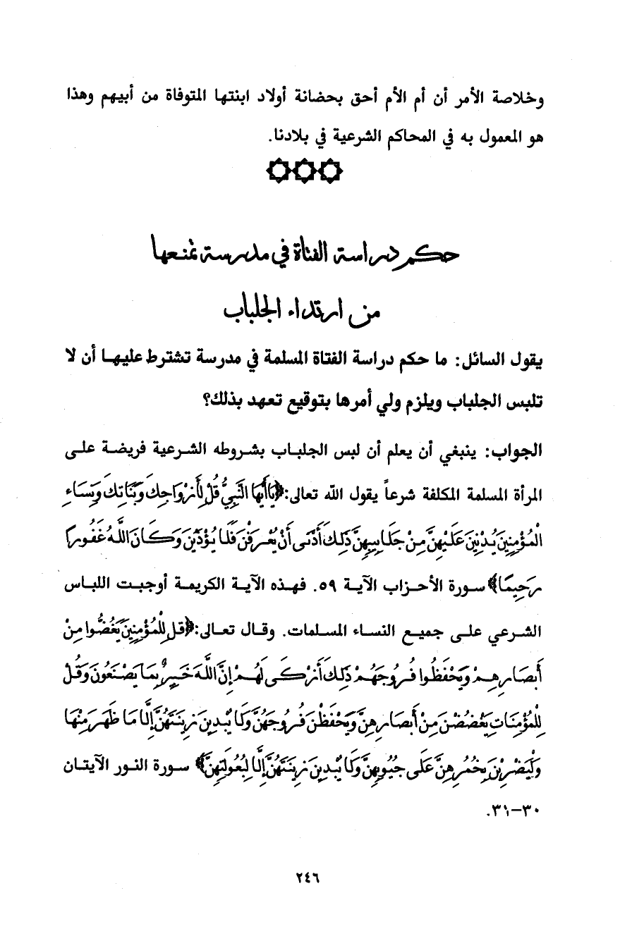 الجواب: ينبغي أن يعلم أن لبس الجلباب بشروطه الشرعية فريضة على المرأة المسلمة المكلفة شرعاً يقول الله تعالى: {يَاأَيُّهَا النَّبِيُّ قُلْ لِأَزْوَاجِكَ وَبَنَاتِكَ وَنِسَاءِ الْمُؤْمِنِينَ يُدْنِينَ عَلَيْهِنَّ مِنْ جَلَابِيبِهِنَّ ذَلِكَ أَدْنَى أَنْ يُعْرَفْنَ فَلَا يُؤْذَيْنَ وَكَانَ اللَّهُ غَفُورًا رَحِيمًا} سورة الأحزاب الآية 59. فهذه الآية الكريمة أوجبت اللباس الشرعي على جميع النساء المسلمات. وقال تعالى: {قل لِلْمُؤْمِنِينَ يَغُضُّوا مِنْ أَبْصَارِهِمْ وَيَحْفَظُوا فُرُوجَهُمْ ذَلِكَ أَزْكَى لَهُمْ إِنَّ اللَّهَ خَبِيرٌ بِمَا يَصْنَعُونَ وَقُلْ لِلْمُؤْمِنَاتِ يَغْضُضْنَ مِنْ أَبْصَارِهِنَّ وَيَحْفَظْنَ فُرُوجَهُنَّ وَلَا يُبْدِينَ زِينَتَهُنَّ إِلَّا مَا ظَهَرَ مِنْهَا وَلْيَضْرِبْنَ بِخُمُرِهِنَّ عَلَى جُيُوبِهِنَّ وَلَا يُبْدِينَ زِينَتَهُنَّ إِلَّا لِبُعُولَتِهِنَّ} سورة النور الآيتان 30 - 31.