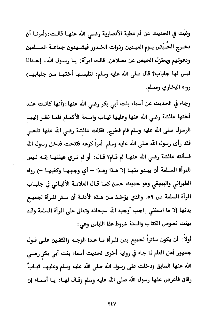وجاء في الحديث عن أسماء بنت أبي بكر رضي الله عنها: (أنها كانت عند أختها عائشة رضي الله عنها وعليها ثياب واسعة الأكمام فلما نظر إليها الرسول صلى الله عليه وسلم قام فخرج. فقالت عائشة رضي الله عنها تنحي فقد رأى رسول الله صلى الله عليه وسلم أمراً كرهه فتنحت فدخل رسول الله فسألته عائشة رضي الله عنها لم قام؟ قال: أو لم تري هيئتها إنه ليس للمرأة المسلمة أن يبدو منها إلا هذا وهذا - أي وجهها وكفيها -) رواه الطبراني والبيهقي وهو حديث حسن كما قال العلامة الألباني في جلباب المرأة المسلمة ص 59. والذي يؤخذ من هذه الأدلة أن ستر المرأة لجميع بدنها إلا ما استثني واجب أوجبه الله سبحانه وتعالى على المرأة المسلمة وقد بينت نصوص الكتاب والسنة شروط هذا اللباس وهي:
