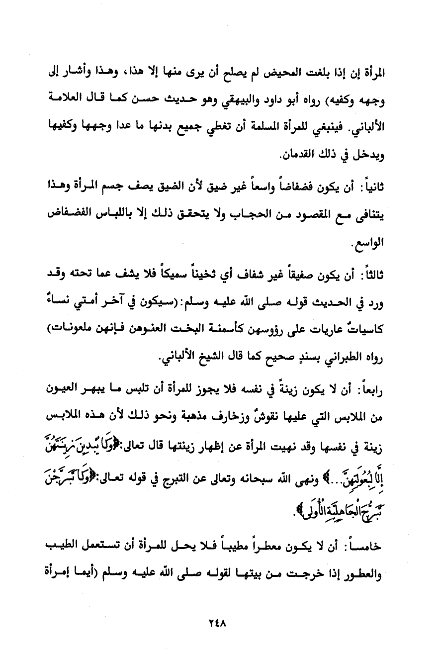 رابعاً: أن لا يكون زينةً في نفسه فلا يجوز للمرأة أن تلبس ما يبهر العيون من الملابس التي عليها نقوشٌ وزخارف مذهبة ونحو ذلك لأن هذه الملابس زينة في نفسها وقد نهيت المرأة عن إظهار زينتها قال تعالى: {وَلَا يُبْدِينَ زِينَتَهُنَّ إِلَّا لِبُعُولَتِهِنَّ ... } ونهى الله سبحانه وتعالى عن التبرج في قوله تعالى: {وَلَا تَبَرَّجْنَ تَبَرُّجَ الْجَاهِلِيَّةِ الْأُولَى}.