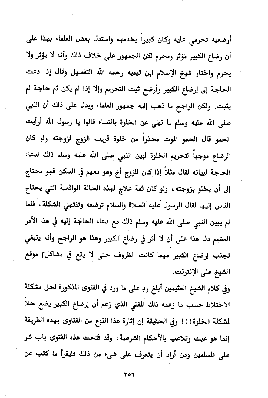 وفي كلام الشيخ العثيمين أبلغ ردٍ على ما ورد في الفتوى المذكورة لحل مشكلة الاختلاط حسب ما زعمه ذلك المفتي الذي زعم أن إرضاع الكبير يضع حلاً لمشكلة الخلوة!!! وفي الحقيقة إن إثارة هذا النوع من الفتاوى بهذه الطريقة إنما هو عبث وتلاعب بالأحكام الشرعية، وقد فتحت هذه الفتوى باب شر على المسلمين ومن أراد أن يتعرف على شيء من ذلك فليقرأ ما كتب عن