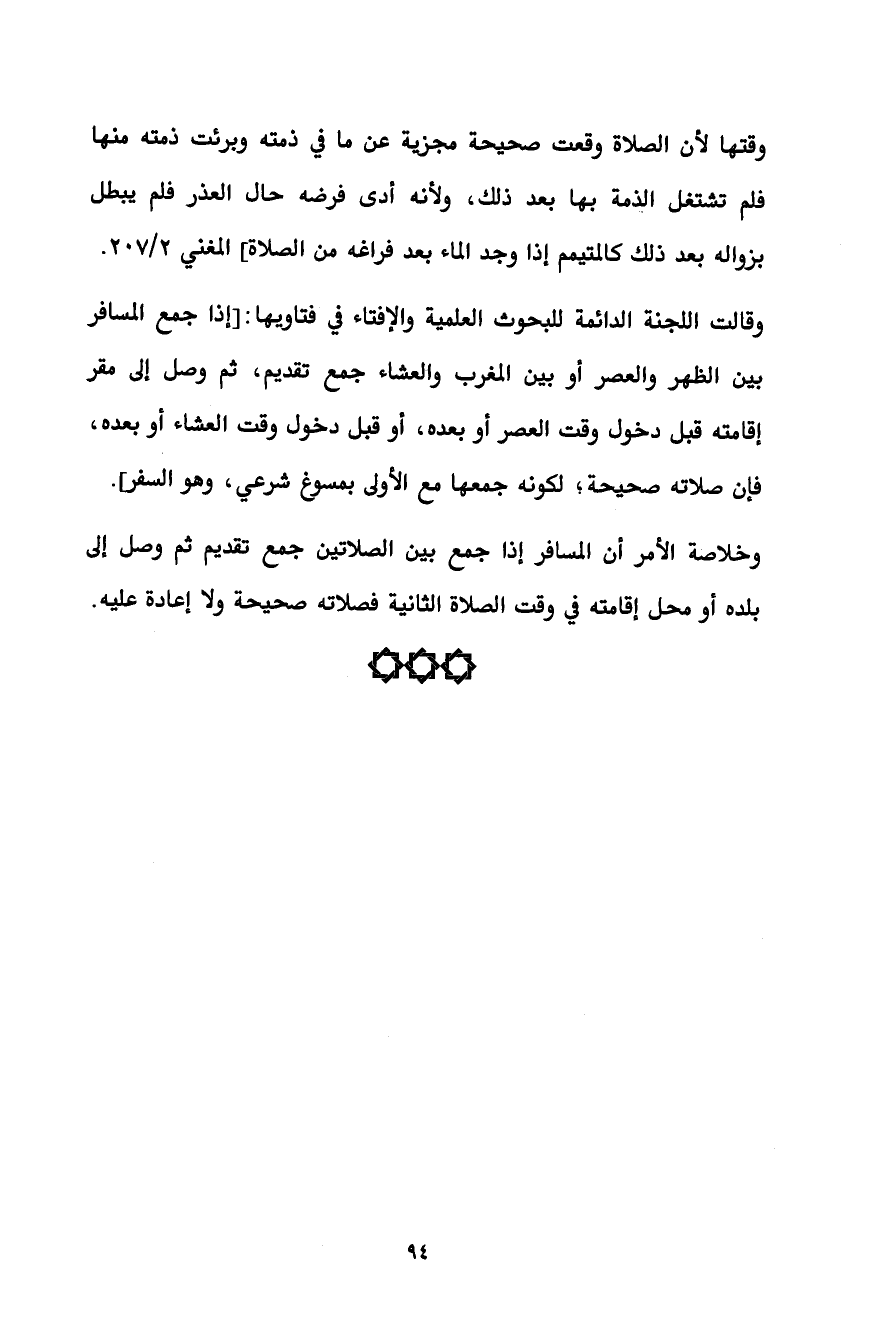 وقالت اللجنة الدائمة للبحوث العلمية والإفتاء في فتاويها: [إذا جمع المسافر بين الظهر والعصر أو بين المغرب والعشاء جمع تقديم، ثم وصل إلى مقر إقامته قبل دخول وقت العصر أو بعده، أو قبل دخول وقت العشاء أو بعده، فإن صلاته صحيحة؛ لكونه جمعها مع الأولى بمسوغ شرعي، وهو السفر].