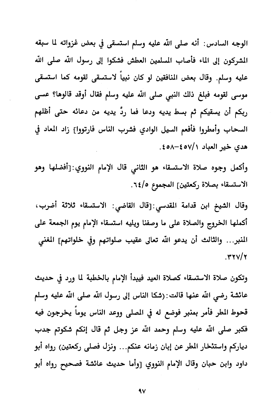 الوجه السادس: أنه صلى الله عليه وسلم استسقى في بعض غزواته لما سبقه المشركون إلى الماء فأصاب المسلمين العطش فشكوا إلى رسول الله صلى الله عليه وسلم. وقال بعض المنافقين لو كان نبياً لاستسقى لقومه كما استسقى موسى لقومه فبلغ ذلك النبي صلى الله عليه وسلم فقال أوقد قالوها؟ عسى ربكم أن يسقيكم ثم بسط يديه ودعا فما ردَّ يديه من دعائه حتى أظلهم السحاب وأمطروا فأفعم السيل الوادي فشرب الناس فارتووا] زاد المعاد في هدي خير العباد 1/ 457 - 458.