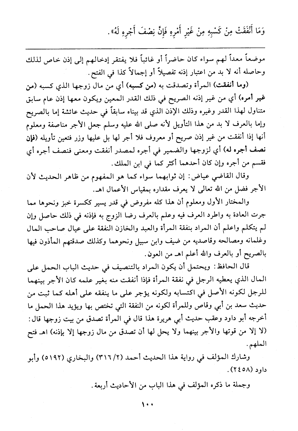 وَمَا أَنْفَقَتْ مِنْ كَسْبِهِ مِنْ غَيرِ أمرِهِ فَإِن نصفَ أَجْرِهِ لَهُ"