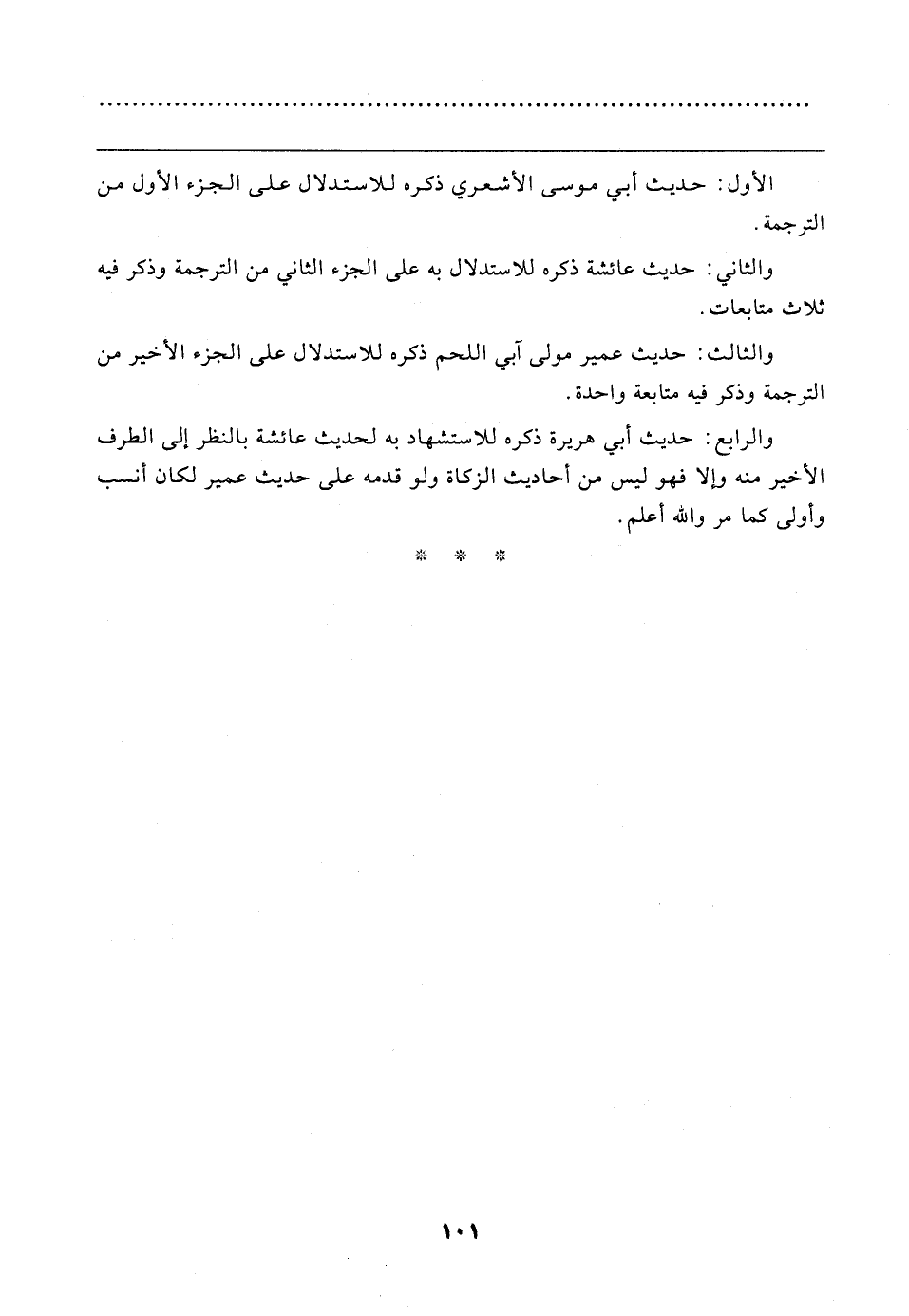 والرابع: حديث أبي هريرة ذكره للاستشهاد به لحديث عائشة بالنظر إلى الطرف الأخير منه وإلا فهو ليس من أحاديث الزكاة ولو قدمه على حديث عمير لكان أنسب وأولى كما والله أعلم.