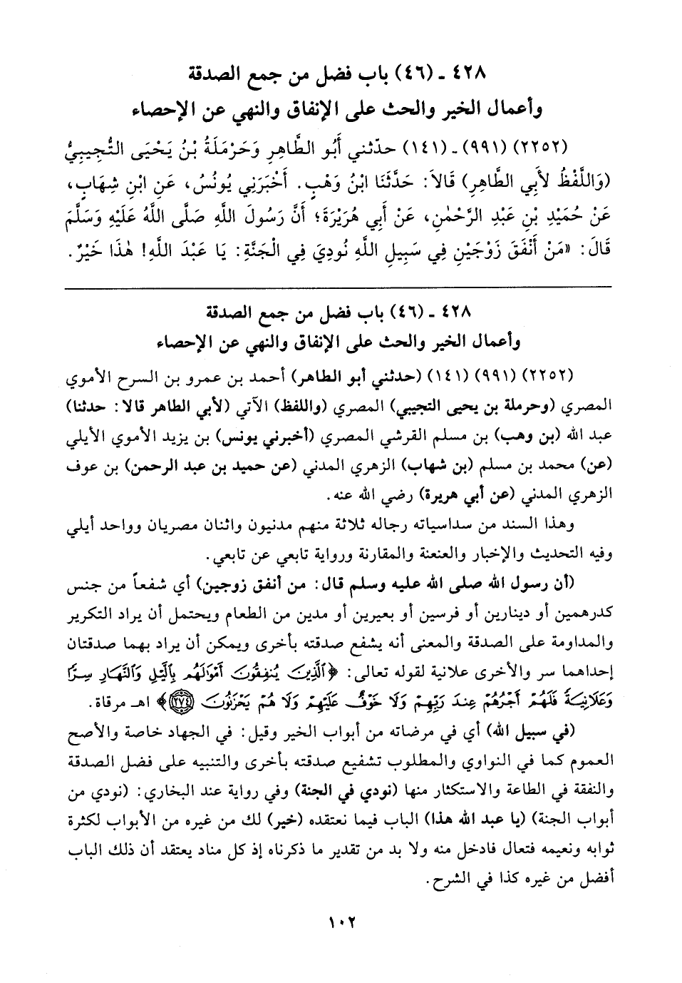 (٢٢٥٢) (٩٩١) - (١٤١) حدّثني أَبُو الطاهِرِ وَحرمَلَةُ بْنُ يَحيَى التجِيبِي (وَاللفْظُ لأَبِي الطاهِرِ) قَالا: حَدَّثَنَا ابْنُ وَهْبٍ. أَخْبَرَنِي يُونُسُ، عَنِ ابْنِ شِهاب، عَنْ حُمَيدِ بْنِ عَبْدِ الرحمنِ، عَنْ أَبِي هُرَيرَةَ؛ أَن رَسُولَ الله صَلى اللهُ عَلَيهِ وَسَلمَ قَال: "مَنْ أَنْفَقَ زَوْجَينِ فِي سَبِيلِ الله نُودِيَ فِي الْجَنةِ: يَا عَبْدَ الله! هذَا خَير