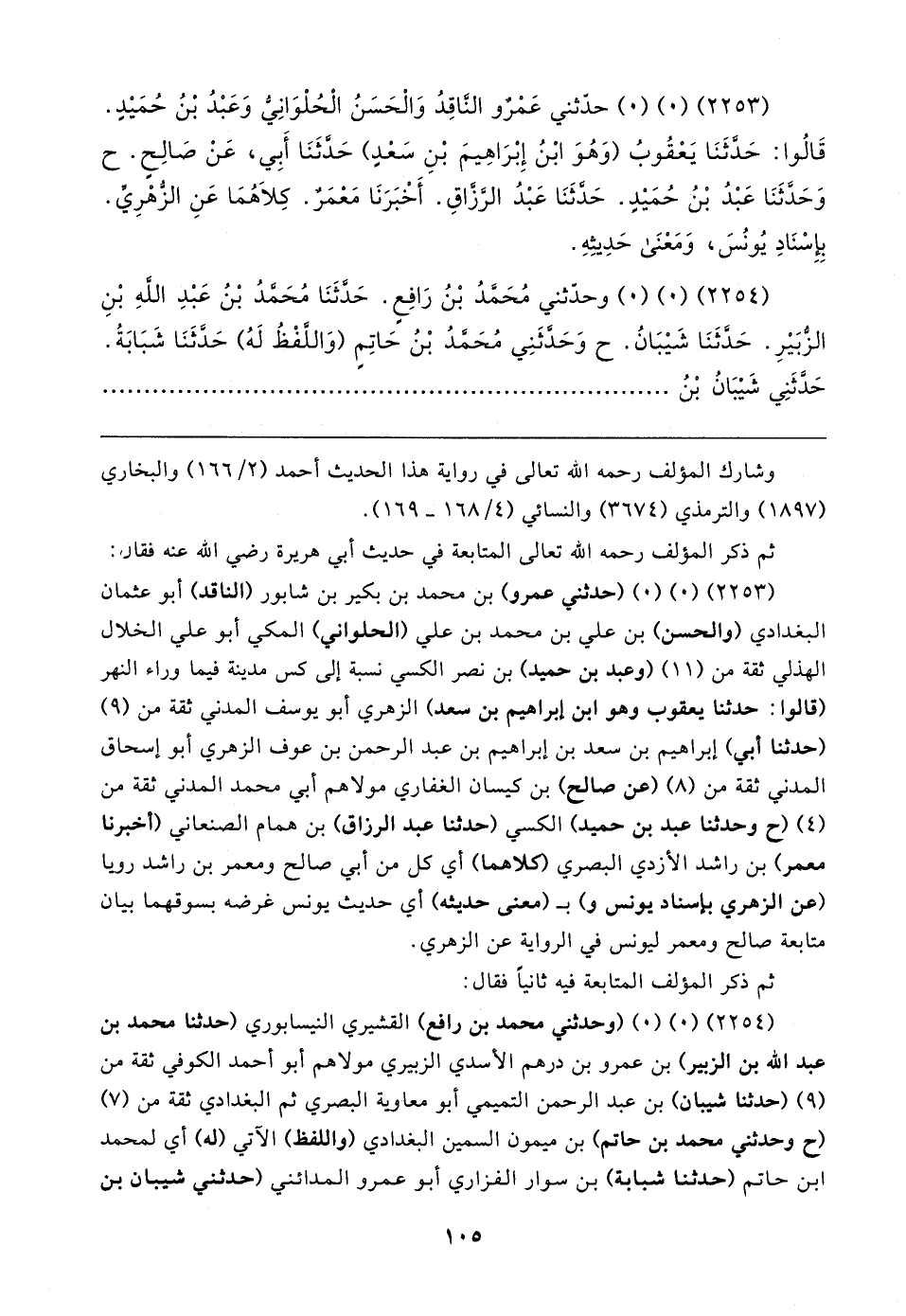 (٢٢٥٣) (٠) (٠) (حدثني عمرو) بن محمد بن بكير بن شابور (الناقد) أبو عثمان البغدادي (والحسن) بن علي بن محمد بن علي (الحلواني) المكي أبو علي الخلال الهذلي ثقة من (١١) (وعبد بن حميد) بن نصر الكسي نسبة إلى كس مدينة فيما وراء النهر (قالوا: حدثنا يعقوب وهو ابن إبراهيم بن سعد) الزهريّ أبو يوسف المدني ثقة من (٩) (حدثنا أبي) إبراهيم بن سعد بن إبراهيم بن عبد الرحمن بن عوف الزهريّ أبو إسحاق المدني ثقة من (٨) (عن صالح) بن كيسان الغفاري مولاهم أبي محمد المدني ثقة من (٤) (ح وحدثنا عبد بن حميد) الكسي (حدثنا عبد الرزاق) بن همام الصنعاني (أخبرنا معمر) بن راشد الأزدي البصري (كلاهما) أي كل من أبي صالح ومعمر بن راشد رويا (عن الزهريّ بإسناد يونس و) بـ (معنى حديثه) أي حديث يونس غرضه بسوقهما بيان متابعة صالح ومعمر ليونس في الرواية عن الزهريّ.