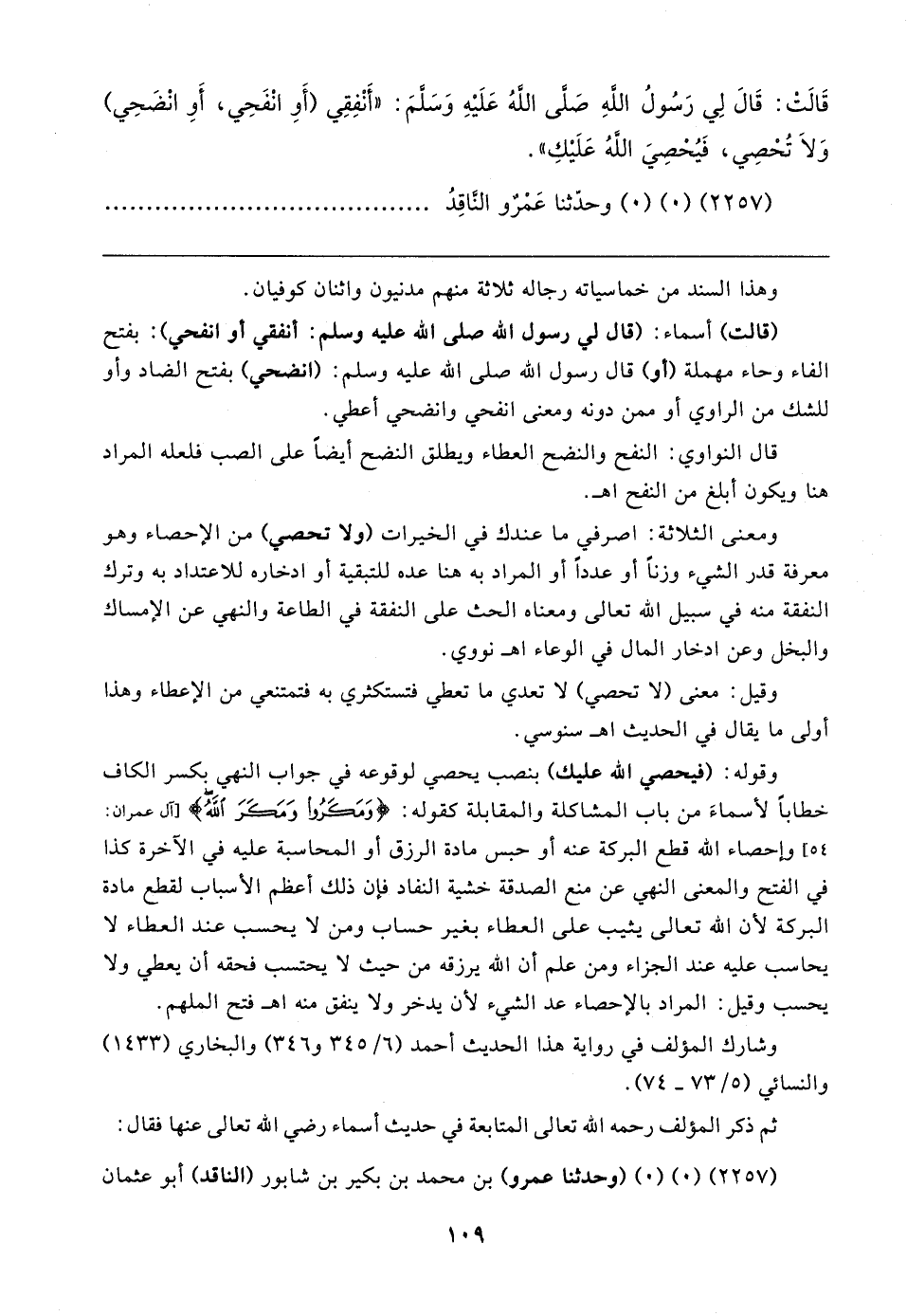 ومعنى الثلاثة: اصرفي ما عندك في الخيرات (ولا تحصي) من الإحصاء وهو معرفة قدر الشيء وزنًا أو عددًا أو المراد به هنا عده للتبقية أو ادخاره للاعتداد به وترك النفقة منه في سبيل الله تعالى ومعناه الحث على النفقة في الطاعة والنهي عن الإمساك والبخل وعن ادخار المال في الوعاء اهـ نووي.