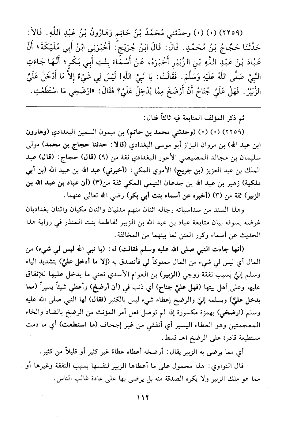 (٢٢٥٩) (٠) (٠) (وحدثني محمد بن حاتم) بن ميمون السمين البغدادي (وهارون بن عبد الله) بن مروان البزاز أبو موسى البغدادي (قال: حدثنا حجاج بن محمد) مولى سليمان بن مجالد المصيصي الأعور البغدادي ثقة من (٩) (قال) حجاج: (قال) عبد الملك بن عبد العزيز (بن جريج) الأموي المكي: (أخبرني) عبد الله بن عبيد الله (بن أبي ملكية) زهير بن عبد الله بن جدعان التيمي المكي ثقة من (٣) (أن عباد بن عبد الله بن الزبير) ثقة من (٣) (أخبره عن أسماء بنت أبي بكر) رضي الله تعالى عنهما.