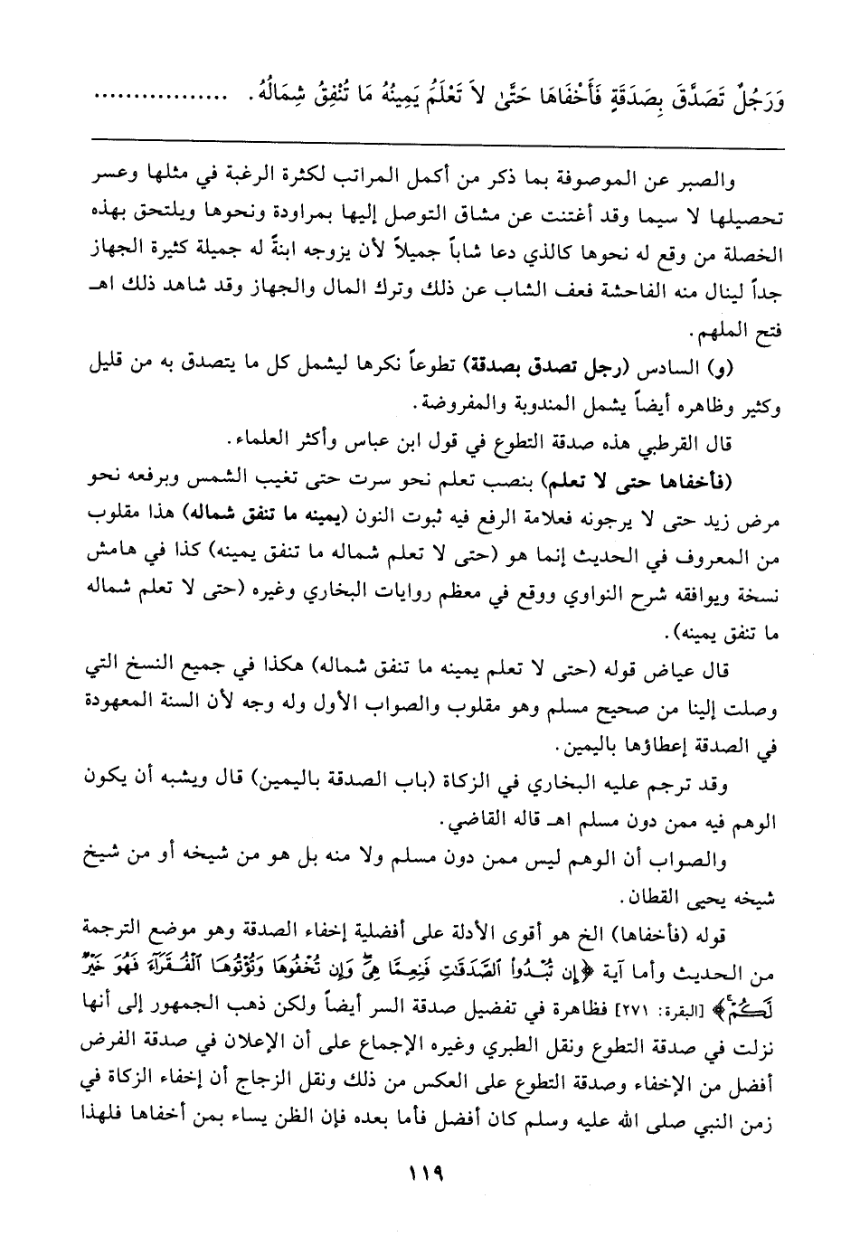 وَرَجُلٌ تَصَدَّقَ بِصَدَقَةٍ فَأَخْفَاها حتَّى لَا تَعلَمُ يَمِينُهُ مَا تُنْفِقُ شِمَالُهُ