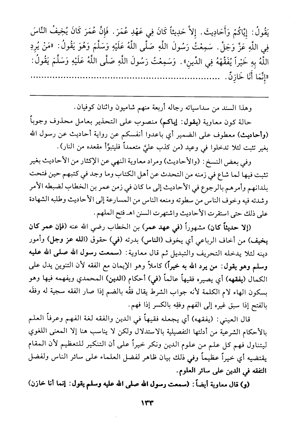يَقُولُ: إِيَّاكُمْ وَأَحَادِيثَ. إلا حَدِيثًا كَانَ فِي عَهْدِ عُمَرَ. فَإِنَّ عُمَرَ كَانَ يُخِيفُ النَّاسَ فِي اللهِ عَز وَجَل. سَمِعْتُ رَسُولَ اللهِ صَلَّى اللهُ عَلَيهِ وَسَلَّمَ وَهُوَ يَقُولُ: "مَنْ يُرِدِ اللهُ بِهِ خَيرًا يُفَقِّهْهُ فِي الدِّينِ". وَسَمِعْتُ رَسُولَ اللهِ صَلَّى اللهُ عَلَيهِ وَسَلَّمَ يَقُولُ: "إِنَّمَا أَنَا خَازِنٌ