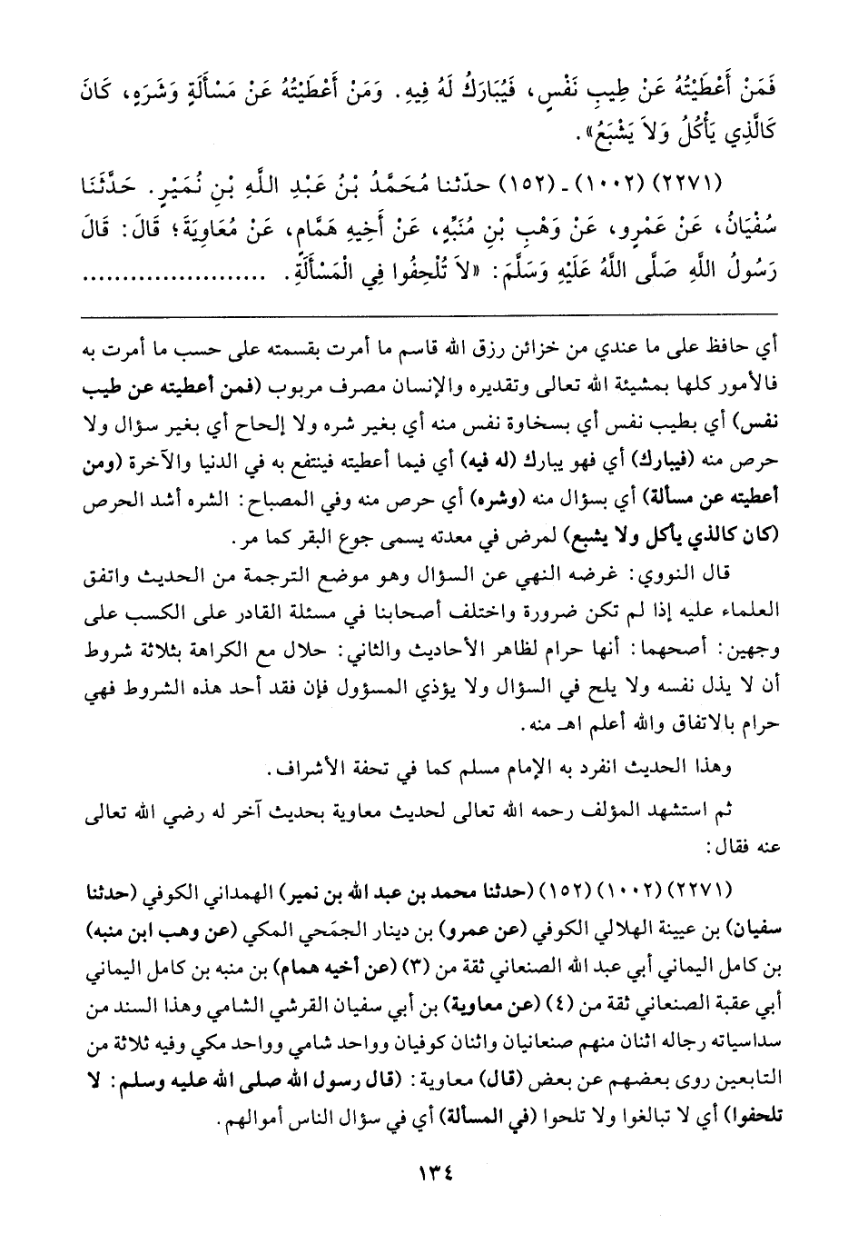 (٢٢٧١) (١٠٠٢) (١٥٢) (حدثنا محمد بن عبد الله بن نمير) الهمداني الكوفي (حدثنا سفيان) بن عيينة الهلالي الكوفي (عن عمرو) بن دينار الجمَحي المكي (عن وهب بن منبه) بن كامل اليماني أبي عبد الله الصنعاني ثقة من (٣) (عن أخيه همام) بن منبه بن كامل اليماني أبي عقبة الصنعاني ثقة من (٤) (عن معاوية) بن أبي سفيان القرشي الشامي وهذا السند من سداسياته رجاله اثنان منهم صنعانيان واثنان كوفيان وواحد شامي وواحد مكي وفيه ثلاثة من التابعين روى بعضهم عن بعض (قال) معاوية: (قال رسول الله صلى الله عليه وسلم: لا تلحفوا) أي لا تبالغوا ولا تلحوا (في المسألة) أي في سؤال الناس أموالهم.