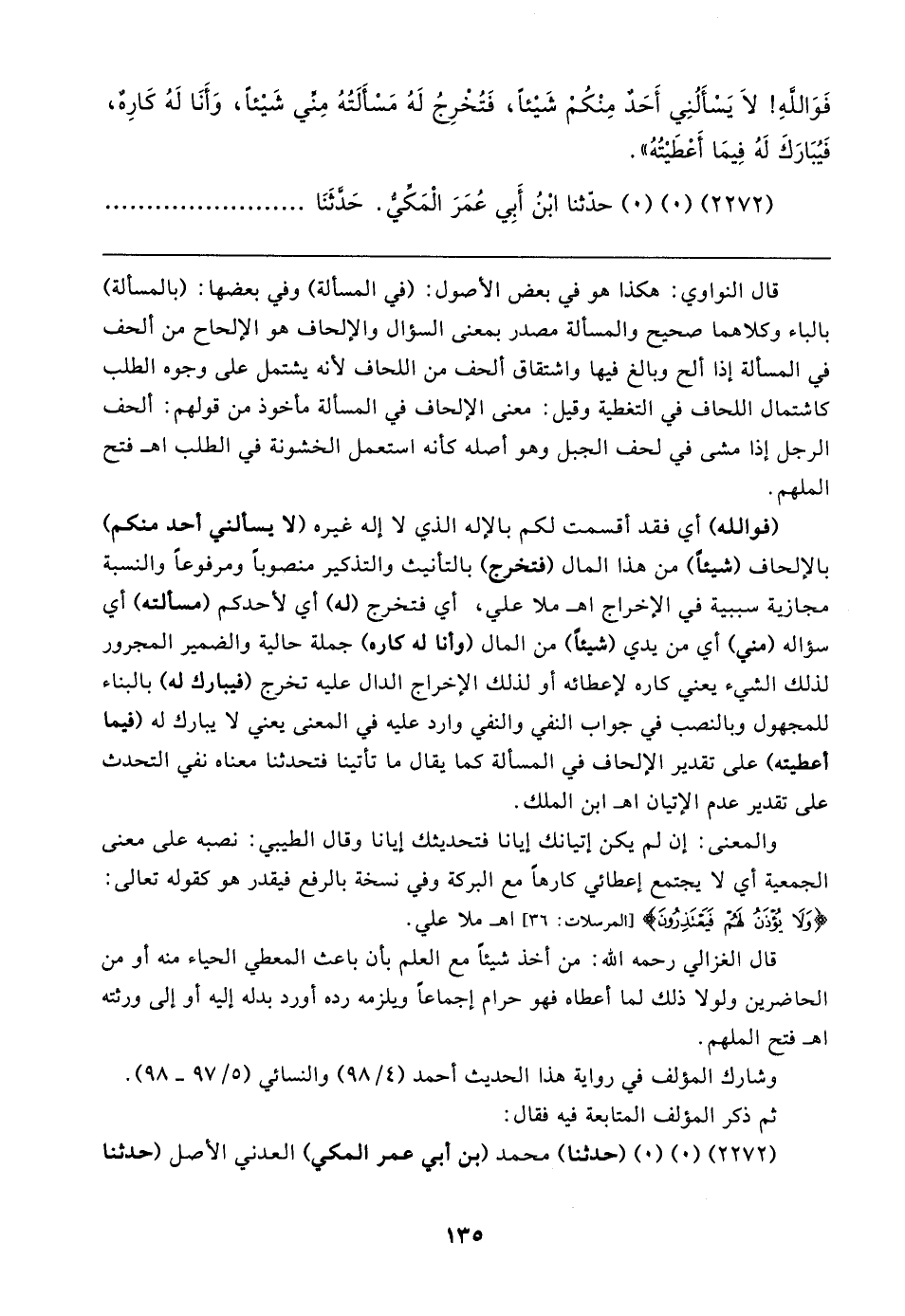 قال النواوي: هكذا هو في بعض الأصول: (في المسألة) وفي بعضها: (بالمسألة) بالباء وكلاهما صحيح والمسألة مصدر بمعنى السؤال والإلحاف هو الإلحاح من ألحف في المسألة إذا ألح وبالغ فيها واشتقاق ألحف من اللحاف لأنه يشتمل على وجوه الطلب كاشتمال اللحاف في التغطية وقيل: معنى الإلحاف في المسألة مأخوذ من قولهم: ألحف الرجل إذا مشى في لحف الجبل وهو أصله كأنه استعمل الخشونة في الطلب اهـ فتح الملهم.