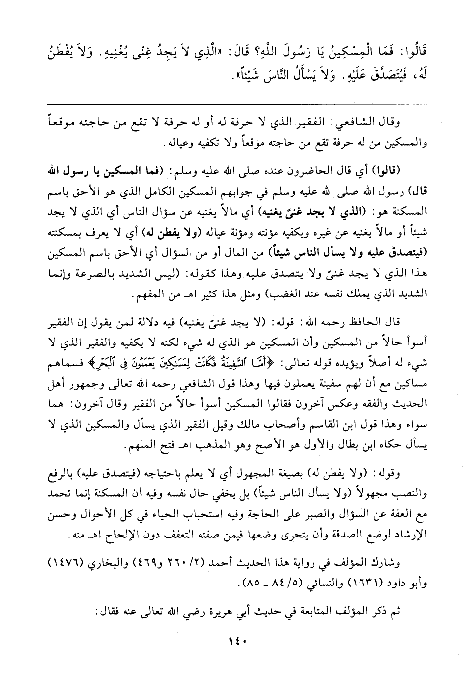 قَالُوا: فَمَا الْمِسْكِينُ يَا رَسُولَ اللهِ؟ قَال: "الَّذِي لَا يَجِدُ غِنًى يُغْنِيهِ. وَلَا يُفْطَنُ لَهُ، فَيُتَصَدَّقَ عَلَيهِ. وَلَا يَسْأَلُ النَّاسَ شَيئًا"