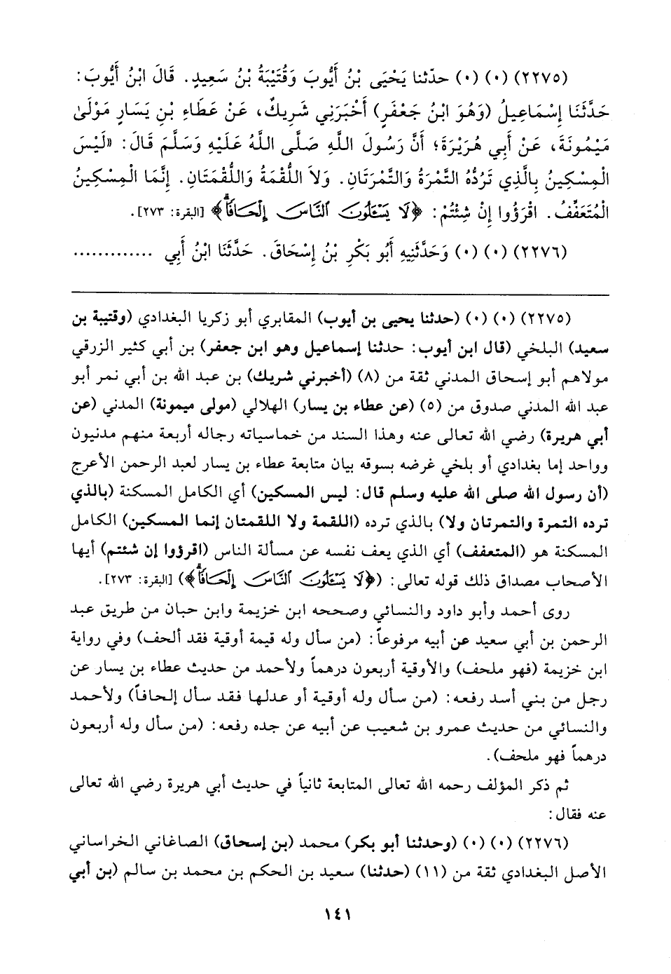 (٢٢٧٥) (٠) (٠) (حدثنا يحيى بن أيوب) المقابري أبو زكريا البغدادي (وقتيبة بن سعيد) البلخي (قال ابن أيوب: حدثنا إسماعيل وهو ابن جعفر) بن أبي كثير الزرقي مولاهم أبو إسحاق المدني ثقة من (٨) (أخبرني شريك) بن عبد الله بن أبي نمر أبو عبد الله المدني صدوق من (٥) (عن عطاء بن يسار) الهلالي (مولى ميمونة) المدني (عن أبي هريرة) رضي الله تعالى عنه وهذا السند من خماسياته رجاله أربعة منهم مدنيون وواحد إما بغدادي أو بلخي غرضه بسوقه بيان متابعة عطاء بن يسار لعبد الرحمن الأعرج (أن رسول الله صلى الله عليه وسلم قال: ليس المسكين) أي الكامل المسكنة (بالذي ترده التمرة والتمرتان ولا) بالذي ترده (اللقمة ولا اللقمتان إنما المسكين) الكامل المسكنة هو (المتعفف) أي الذي يعف نفسه عن مسألة الناس (اقرووا إن شئتم) أيها الأصحاب مصداق ذلك قوله تعالى: {لَا يَسْأَلُونَ النَّاسَ إِلْحَافًا} [البقرة: ٢٧٣].