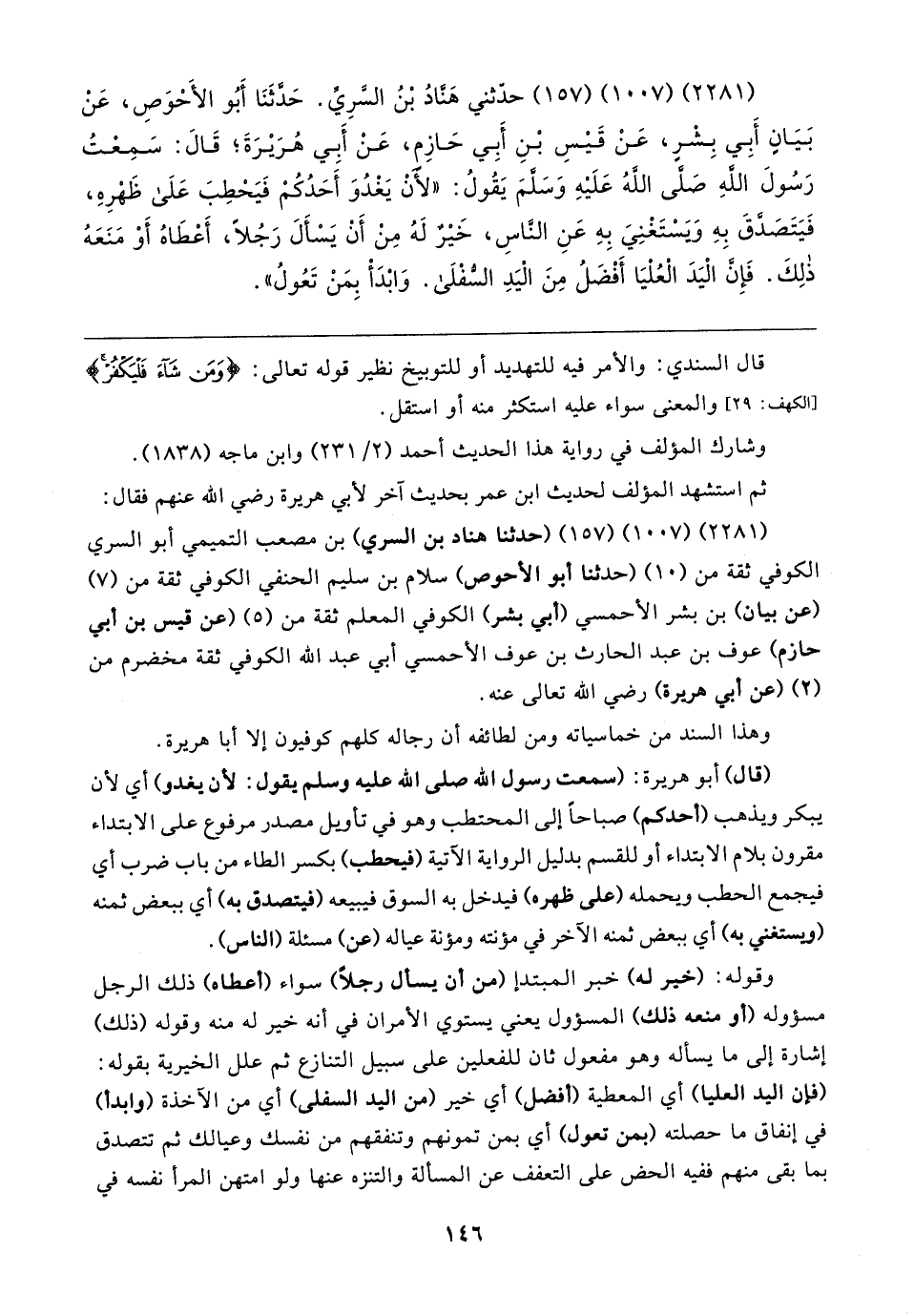(٢٢٨١) (١٠٠٧) (١٥٧) حدّثني هَنَّادُ بْنُ السَّرِيِّ. حَدَّثَنَا أبُو الأَحْوَصِ، عَنْ بَيَانِ أَبِي بِشْرٍ، عَنْ قَيسِ بْنِ أَبِي حَازِم، عَنْ أَبِي هُرَيرَةَ؛ قَال: سَمِعْتُ رَسُولَ اللهِ صَلَّى اللهُ عَلَيهِ وَسَلَّمَ يَقُولُ: "لأَنْ يَغْدُوَ أَحَدُكُمْ فَيَحْطِبَ عَلَى ظَهْرِهِ، فَيَتَصَدَّقَ بِهِ وَيَسْتَغْنِيَ بِهِ عَنِ النَّاسِ، خَيرٌ لَهُ مِنْ أَنْ يَسْألَ رَجُلًا، أَعْطَاهُ أَوْ مَنَعَهُ ذلِكَ. فَإِن الْيَدَ الْعُلْيَا أَفْضَلُ مِنَ الْيَدِ السُّفْلَى. وَابْدَأْ بِمَنْ تَعُولُ"