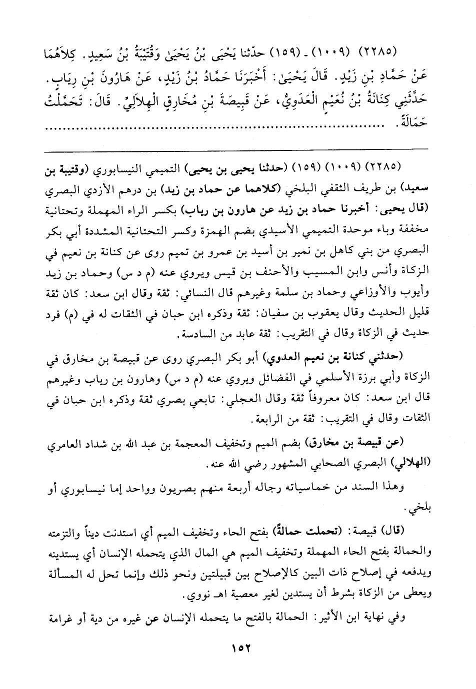 (٢٢٨٥) (١٠٠٩) - (١٥٩) حدَّثنا يَحْيَى بْنُ يَحْيَى وَقُتَيبَةُ بْنُ سَعِيدٍ. كِلاهُمَا عَنْ حَمَّادِ بْنِ زَيدٍ. قَال يَحْيَى: أَخْبَرَنَا حَمَّادُ بْنُ زَيدٍ، عَنْ هَارُونَ بْنِ رِيَابٍ. حَدَّثَنِي كِنَانَةُ بْنُ نُعَيمٍ الْعَدَويُّ، عَنْ قَبِيصَةَ بْنِ مُخَارِقٍ الْهِلالِيِّ. قَال: تَحَمَّلْتُ حَمَالةً