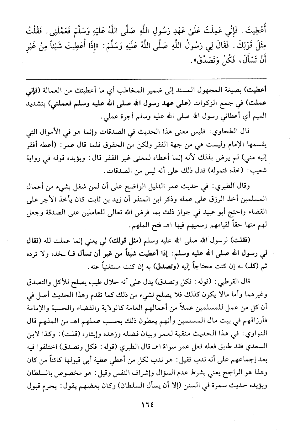 قال القرطبي: (قوله: فكل وتصدق) يدل على أنه حلال طيب يصلح للأكل والتصدق وغيرهما وأما ما لا يكون كذلك فلا يصلح لشيء من ذلك كما تقدم وهذا الحديث أصل في أن كل من عمل للمسلمين عملًا من أعمالهم العامة كالولاية والقضاء والحسبة والإمامة فأرزاقهم في بيت مال المسلمين وأنهم يعطون ذلك بحسب عملهم اهـ من المفهم قال النواوي: في هذا الحديث منقبة لعمر وبيان فضله وزهده وإيثاره (قلت): وكذا لابن السعدي فقد طابق فعله فعل عمر سواءً اهـ قال الطبري (قوله: فكل وتصدق) اختلفوا فيه بعد إجماعهم على أنه ندب فقيل: هو ندب لكل من أعطي عطية أبي قبولها كائنًا من كان وهذا هو الراجح يعني بشرط عدم السؤال وإشراف النفس وقيل: هو مخصوص بالسلطان ويؤيده حديث سمرة في السنن (إلا أن يسأل السلطان) وكان بعضهم يقول: يحرم قبول