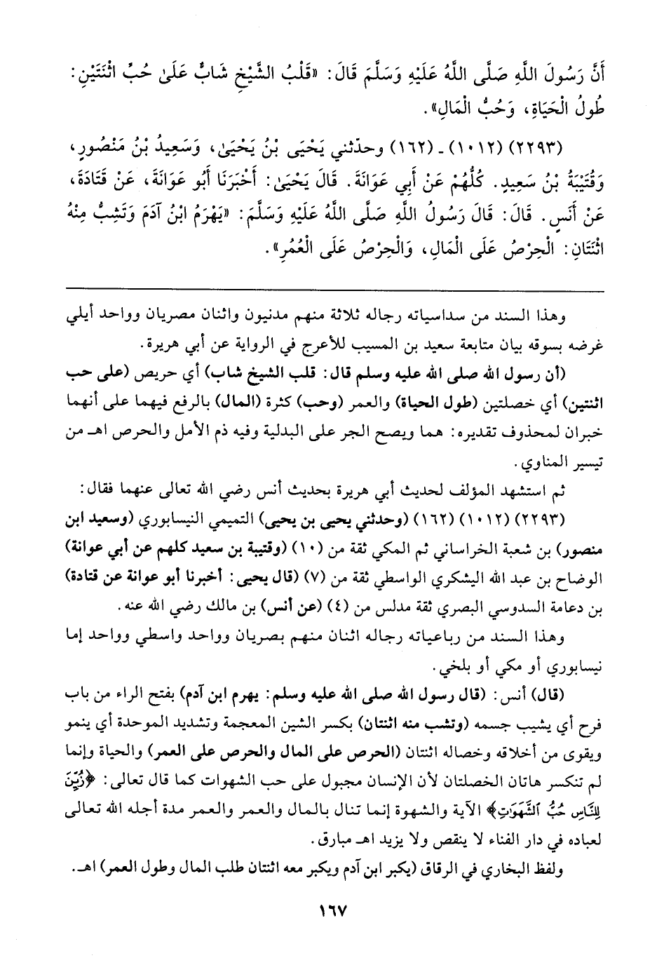 (٢٢٩٣) (١٠١٢) - (١٦٢) وحدّثني يَحْيَى بْنُ يَحْيَى، وَسَعِيدُ بْنُ مَنْصُورٍ، وَقُتَيبَةُ بْنُ سَعِيدٍ. كُلُّهُمْ عَنْ أَبِي عَوَانَةَ. قَال يَحْيَى: أَخْبَرَنَا أَبُو عَوَانَةَ، عَنْ قَتَادَةَ، عَنْ أَنَسٍ. قَال: قَال رَسُولُ اللهِ صَلَّى اللهُ عَلَيهِ وَسَلَّمَ: "يَهْرَمُ ابْنُ آدَمَ وَتَشِبُّ مِنْهُ اثْنَتَانِ: الْحِرْصُ عَلَى الْمَالِ، وَالْحِرْصُ عَلَى الْعُمُرِ"