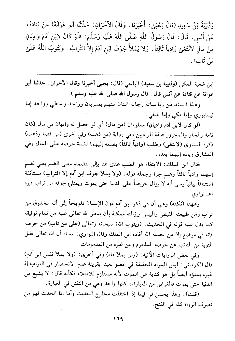 وَقُتَيبَةُ بْنُ سَعِيدٍ (قَال يَحْيَى: أَخْبَرَنَا. وَقَال الآخَرَانِ: حَدَّثَنَا أَبُو عَوَانَةَ) عَنْ قَتَادَةَ، عَنْ أَنَسٍ. قَال: قَال رَسُولُ اللهِ صَلَّى اللهُ عَلَيهِ وَسَلَّمَ: "لَوْ كَانَ لا بْنِ آدَمَ وَادِيَانِ مِنْ مَالٍ لابْتَغَى وَادِيًا ثَالِثًا. وَلَا يَمْلأُ جَوْفَ ابْنِ آدَمَ إلا التُّرَابُ. وَيتُوبُ اللهُ عَلَى مَنْ تَابَ"