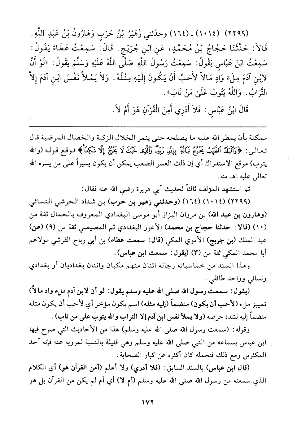 (٢٢٩٩) (١٠١٤) - (١٦٤) وحدّثني زُهَيرُ بْنُ حَرْبٍ وَهَارُونُ بْنُ عَبْدِ اللهِ. قَالا: حَدَّثَنَا حَجَّاجُ بْنُ مُحَمَّدِ، عَنِ ابْنِ جُرَيجٍ. قَال: سَمِعْتُ عَطَاءَ يَقُولُ: سَمِعْتُ ابْنَ عَبَّاسٍ يَقُولُ: سَمِعْتُ رَسُولَ اللهِ صَلَّى اللهُ عَلَيهِ وَسَلَّمَ يَقُولُ: "لَوْ أَنَّ لابْنِ آدَمَ مِلْءَ وَادٍ مَالًا لأَحَبَّ أَنْ يَكُونَ إِلَيهِ مِثْلُهُ. وَلَا يَمْلأُ نَفْسَ ابْنِ آدَمَ إلا التُّرَابُ. وَاللهُ يَتُوبُ عَلَى مَنْ تَابَ".