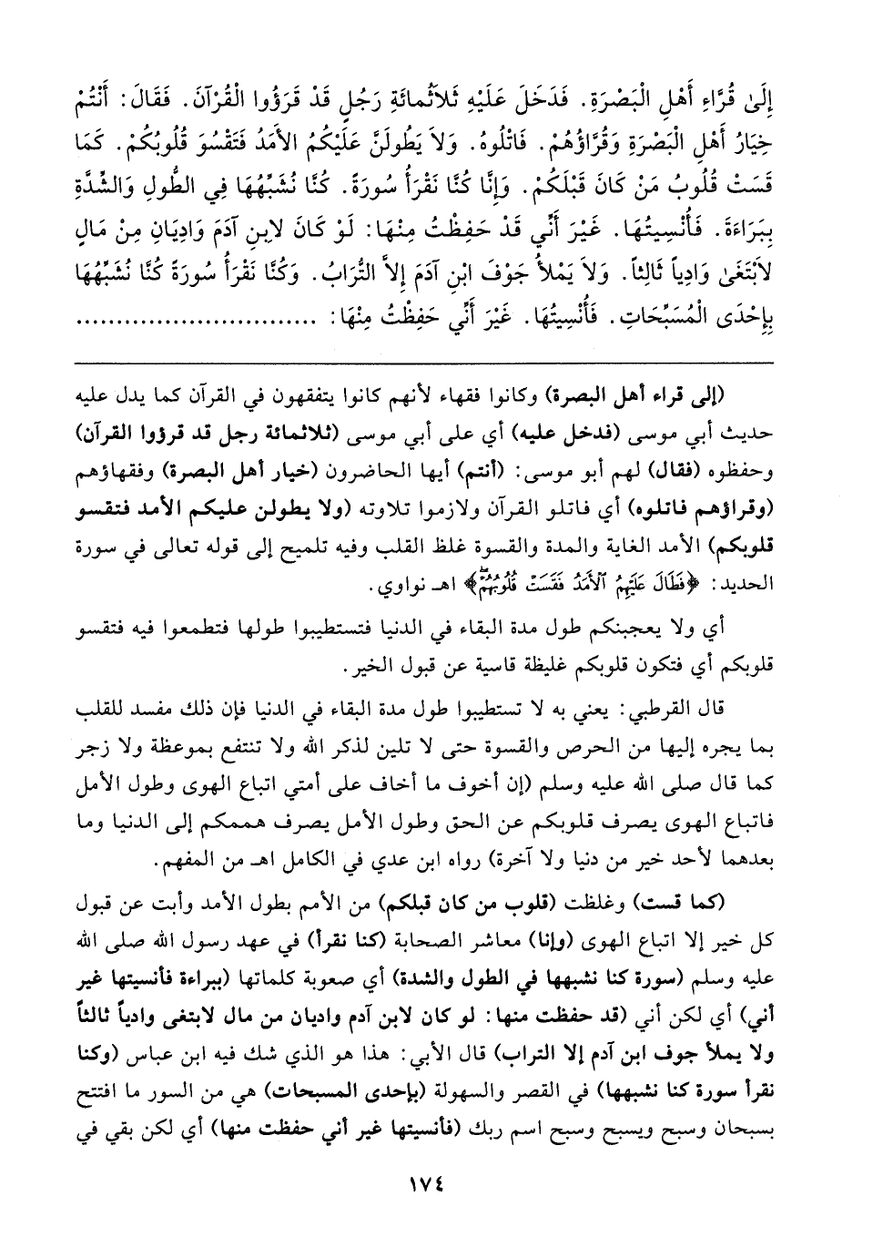 (كما قست) وغلظت (قلوب من كان قبلكم) من الأمم بطول الأمد وأبت عن قبول كل خير إلا اتباع الهوى (وإنا) معاشر الصحابة (كنا نقرأ) في عهد رسول الله صلى الله عليه وسلم (سورة كنا نشبهها في الطول والشدة) أي صعوبة كلماتها (ببراءة فأنسيتها غير أني) أي لكن أني (قد حفظت منها: لو كان لابن آدم واديان من مال لابتغى واديًا ثالثًا ولا يملأ جوف ابن آدم إلا التراب) قال الأبي: هذا هو الذي شك فيه ابن عباس (وكنا نقرأ سورة كنا نشبهها) في القصر والسهولة (بإحدى المسبحات) هي من السور ما افتتح بسبحان وسبح ويسبح وسبح اسم ربك (فأنسيتها غير أني حفظت منها) أي لكن بقي في