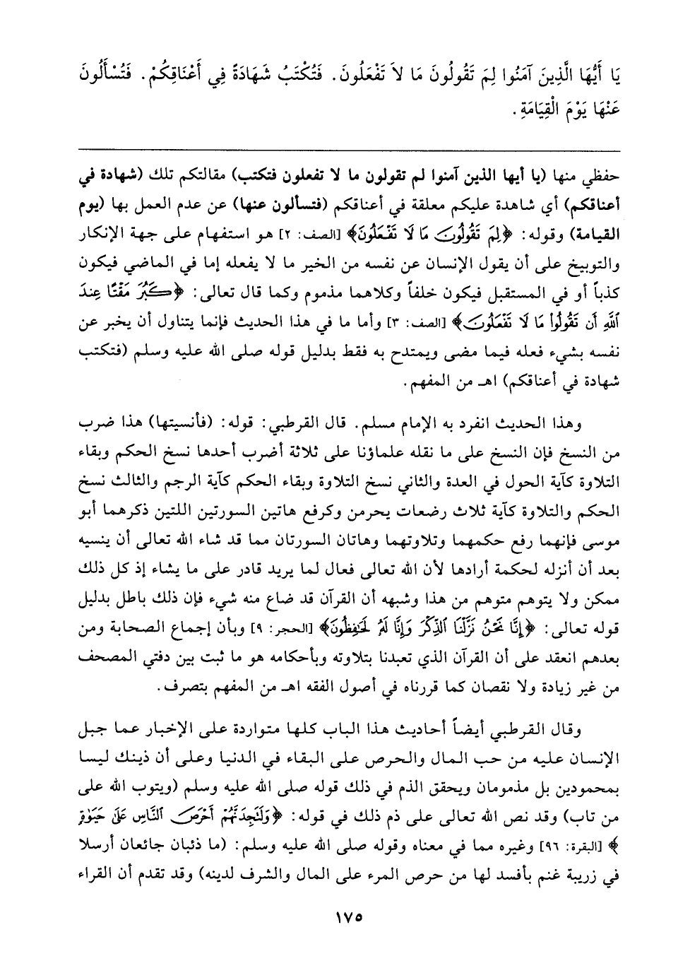 وهذا الحديث انفرد به الإمام مسلم. قال القرطبي: قوله: (فأنسيتها) هذا ضرب من النسخ فإن النسخ على ما نقله علماؤنا على ثلاثة أضرب أحدها نسخ الحكم وبقاء التلاوة كآية الحول في العدة والثاني نسخ التلاوة وبقاء الحكم كآية الرجم والثالث نسخ الحكم والتلاوة كآية ثلاث رضعات يحرمن وكرفع هاتين السورتين اللتين ذكرهما أبو موسى فإنهما رفع حكمهما وتلاوتهما وهاتان السورتان مما قد شاء الله تعالى أن ينسيه بعد أن أنزله لحكمة أرادها لأن الله تعالى فعال لما يريد قادر على ما يشاء إذ كل ذلك ممكن ولا يتوهم متوهم من هذا وشبهه أن القرآن قد ضاع منه شيء فإن ذلك باطل بدليل قوله تعالى: {إِنَّا نَحْنُ نَزَّلْنَا الذِّكْرَ وَإِنَّا لَهُ لَحَافِظُونَ} [الحجر: ٩] وبأن إجماع الصحابة ومن بعدهم انعقد على أن القرآن الذي تعبدنا بتلاوته وبأحكامه هو ما ثبت بين دفتي المصحف من غير زيادة ولا نقصان كما قررناه في أصول الفقه اهـ من المفهم بتصرف.