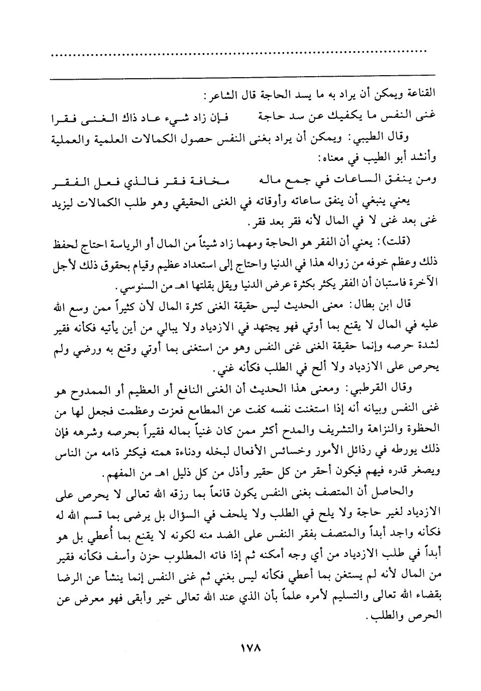 (قلت): يعني أن الفقر هو الحاجة ومهما زاد شيئًا من المال أو الرياسة احتاج لحفظ ذلك وعظم خوفه من زواله هذا في الدنيا واحتاج إلى استعداد عظيم وقيام بحقوق ذلك لأجل الآخرة فاستبان أن الفقر يكثر بكثرة عرض الدنيا ويقل بقلتها اهـ من السنوسي.