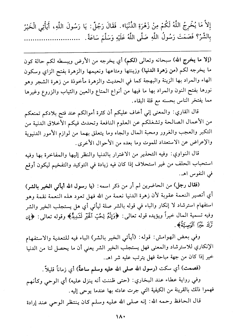 إِلَّا مَا يُخْرِجُ اللهُ لَكُمْ مِنْ زَهْرَةِ الدُّنْيَا". فَقَال رَجُل: يَا رَسُولَ اللهِ، أَيَأْتِي الْخَيرُ بِالشَّرِّ؟ فَصَمَتَ رَسُولُ اللهِ صَلَّى اللهُ عَلَيهِ وَسَلَّمَ سَاعَةً