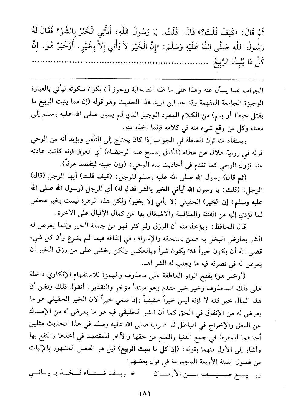 ثُمَّ قَال: "كَيفَ قُلْتَ؟ " قَال: قُلْتُ: يَا رَسُولَ اللهِ، أَيَأْتِي الْخَيرُ بِالشَّرِّ؟ فَقَال لَهُ رَسُولُ اللهِ صَلَّى اللهُ عَلَيهِ وَسَلَّمَ: "إِن الْخَيرَ لَا يَأْتِي إِلَّا بِخَيرٍ. أَوَ خَيرٌ هُوَ. إِن كُلَّ مَا يُنْبِتُ الرَّبِيعُ