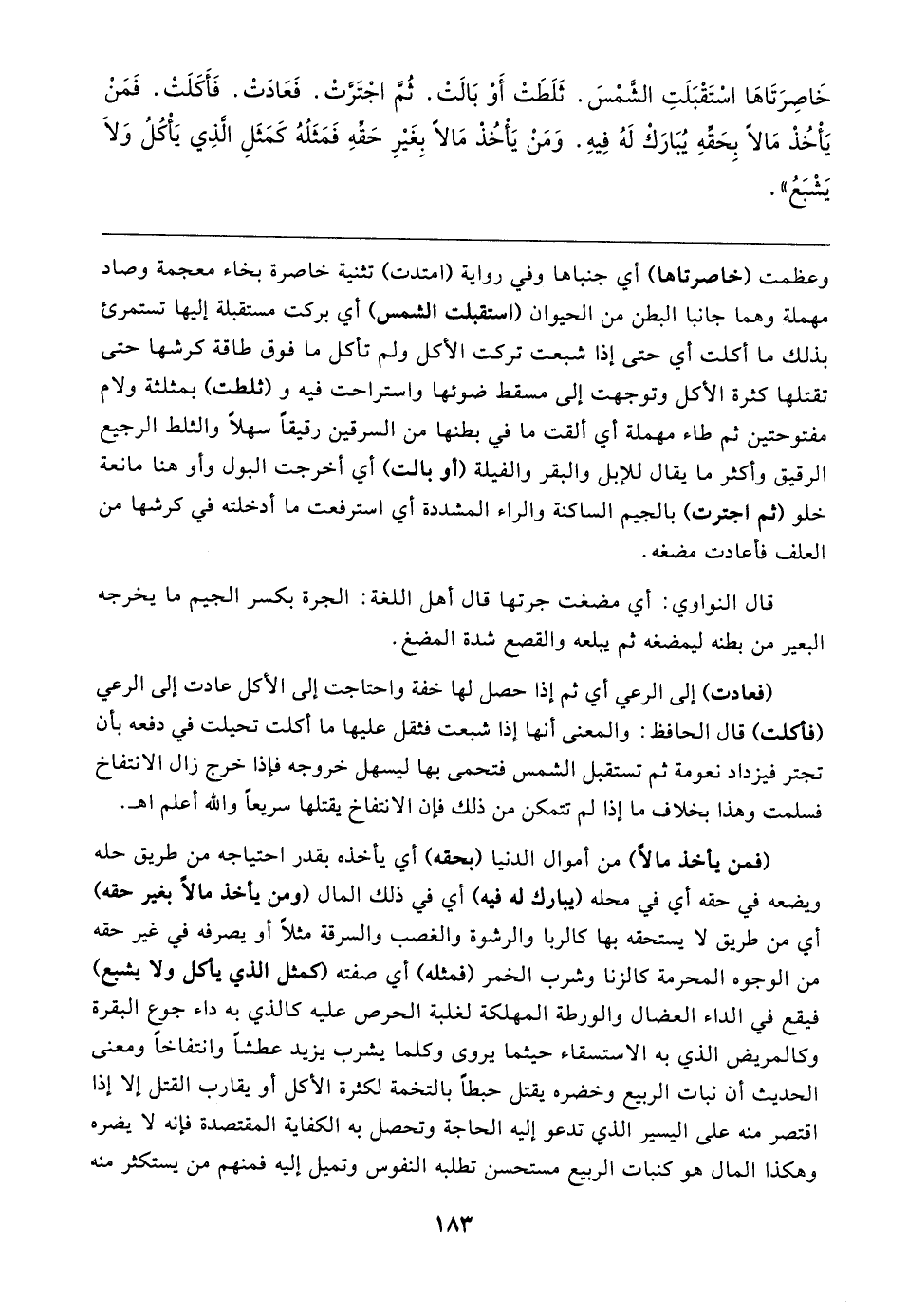خَاصِرَتَاهَا اسْتَقْبَلَتِ الشَّمْسَ. ثَلَطَتْ أَوْ بَالتْ. ثُمَّ اجْتَرَّتْ. فَعَادَتْ. فَأَكَلَتْ. فَمَنْ يَأْخُذْ مَالًا بِحَقِّهِ يُبَارَكْ لَهُ فِيهِ. وَمَنْ يَأْخُذْ مَالًا بِغَيرِ حَقِّهِ فَمَثَلُهُ كَمَثَلِ الَّذِي يَأْكُلُ وَلَا يَشْبَعُ"