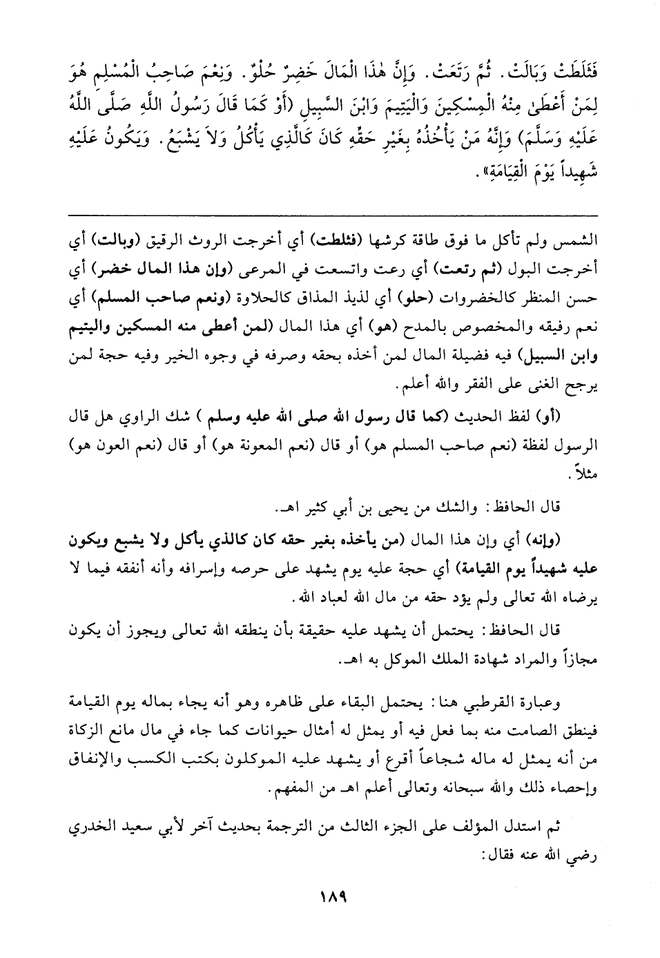 فَثَلَطَتْ وَبَالتْ. ثُمَّ رَتَعَتْ. وَإِنَّ هذَا الْمَال خَضِرٌ حُلْوٌ. وَيعْمَ صَاحِبُ الْمُسْلِمِ هُوَ لِمَنْ أَعْطَى مِنْهُ الْمِسْكِينَ وَالْيَتِيمَ وَابْنَ السَّبِيلِ (أَوْ كَمَا قَال رَسُولُ اللهِ صَلَّى اللهُ عَلَيهِ وَسَلَّمَ) وَإِنَّهُ مَنْ يَأْخُذُهُ بِغَيرِ حَقِّهِ كَانَ كَالَّذِي يَأْكُلُ وَلَا يَشْبَعُ. ويكُونُ عَلَيهِ شَهِيدًا يَوْمَ الْقِيَامَةِ"