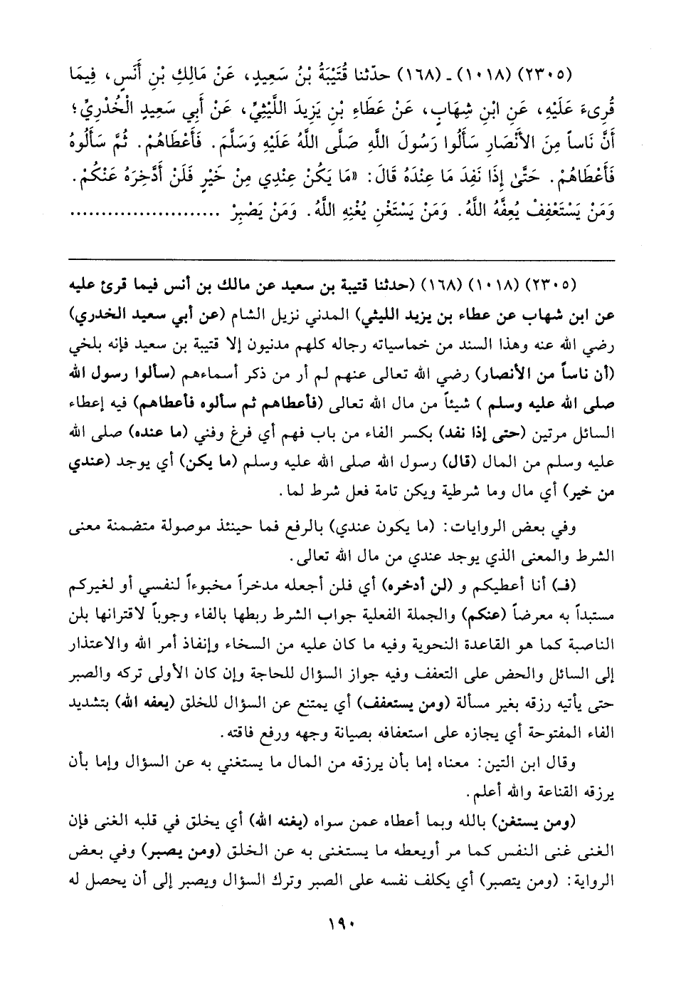 (٢٣٠٥) (١٠١٨) - (١٦٨) حدَّثنا قُتَيبَةُ بْنُ سَعِيدٍ، عَنْ مَالِكِ بْنِ أَنَسٍ، فِيمَا قُرِئَ عَلَيهِ، عَنِ ابْنِ شِهَابٍ، عَنْ عَطَاءِ بْنِ يَزِيدَ اللَّيثِيِّ، عَنْ أَبِي سَعِيدٍ الْخُدْرِيِّ؛ أن نَاسًا مِنَ الأنصَارِ سَأَلُوا رَسُولَ اللهِ صَلَّى اللهُ عَلَيهِ وَسَلَّمَ. فَأَعْطَاهُمْ. ثُمَّ سَأَلُوهُ فَأَعْطَاهُمْ. حَتى إِذَا نَفِدَ مَا عِنْدَهُ قَال: "مَا يَكُنْ عِنْدِي مِنْ خَيرٍ فَلَنْ أَدَّخِرَهُ عَنْكُمْ. وَمَنْ يَسْتَعْفِفْ يُعِفَّهُ اللهُ. وَمَنْ يَسْتَغْنِ يُغْنِهِ اللهُ. وَمَنْ يَصْبِرْ