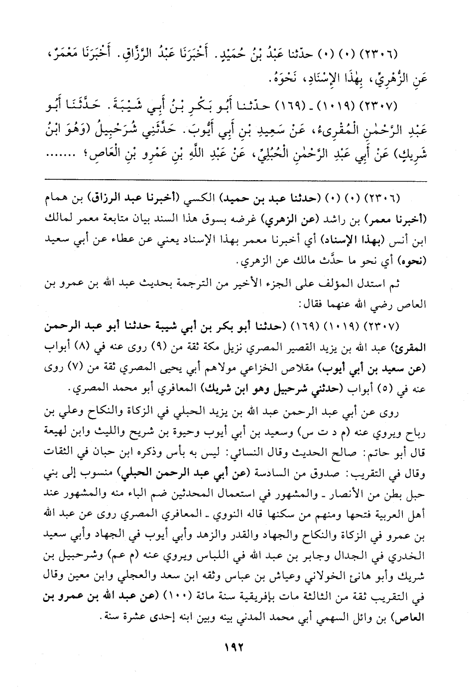 (٢٣٠٧) (١٠١٩) (١٦٩) (حدثنا أبو بكر بن أبي شيبة حدثنا أبو عبد الرحمن المقرئ) عبد الله بن يزيد المّصير المصري نزيل مكة ثقة من (٩) روى عنه في (٨) أبواب (عن سعيد بن أبي أيوب) مقلاص الخزاعي مولاهم أبي يحيى المصري ثقة من (٧) روى عنه في (٥) أبواب (حدثني شرحبيل وهو ابن شريك) المعافري أبو محمد المصري.