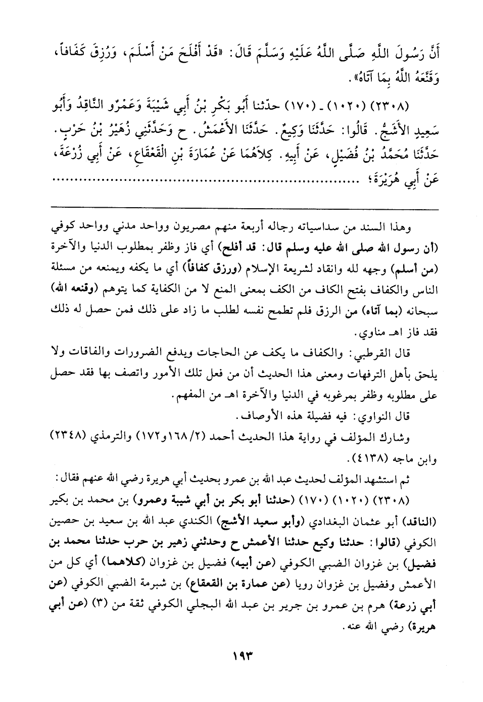 (٢٣٠٨) (١٠٢٠) (١٧٥) (حدثنا أبو بكر بن أبي شيبة وعمرو) بن محمد بن بكير (الناقد) أبو عثمان البغدادي (وأبو سعيد الأشج) الكندي عبد الله بن سعيد بن حصين الكوفي (قالوا: حدثنا وكيع حدثنا الأعمش ح وحدثني زهير بن حرب حدثنا محمد بن فضيل) بن غزوان الضبي الكوفي (عن أبيه) فضيل بن غزوان (كلاهما) أي كل من الأعمش وفضيل بن غزوان رويا (عن عمارة بن القعقاع) بن شبرمة الضبي الكوفي (عن أبي زرعة) هرم بن عمرو بن جرير بن عبد الله البجلي الكوفي ثقة من (٣) (عن أبي هريرة) رضي الله عنه.