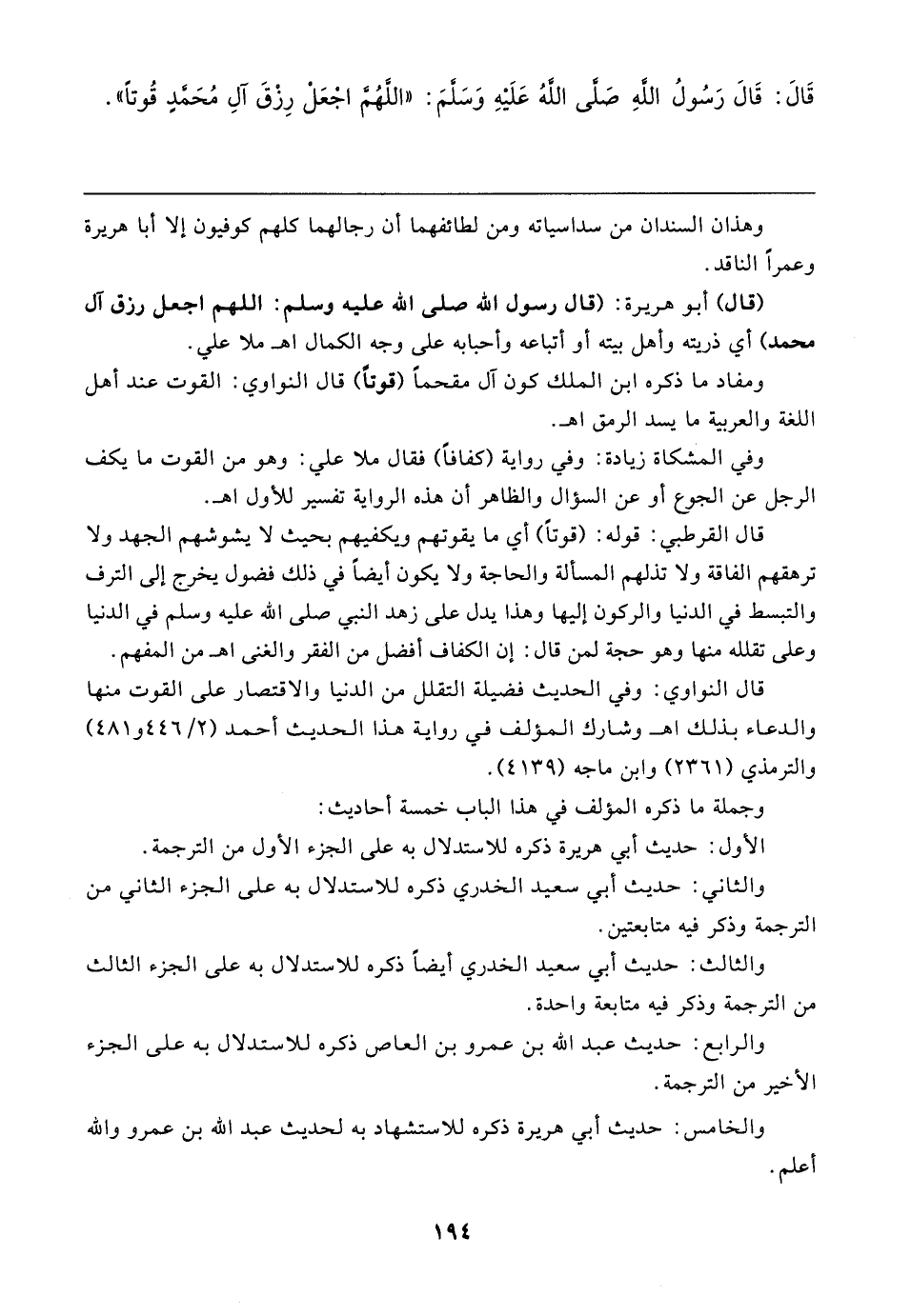 قَال: قَال رَسُولُ اللهِ صَلَّى اللهُ عَلَيهِ وَسَلَّمَ: "اللَّهُمَّ اجْعَلْ رِزْقَ آلِ مُحَمَّدٍ قُوتًا"