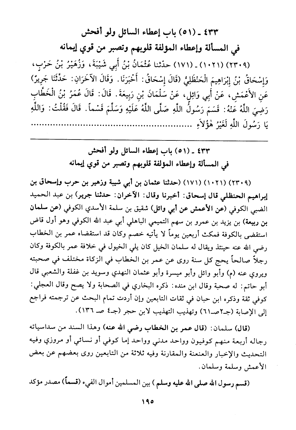 (٢٣٠٩) (١٠٢١) - (١٧١) حدَّثنا عُثْمَانُ بْنُ أَبِي شَيبَةَ، وَزُهَيرُ بْنُ حَرْبٍ، وَإِسْحَاقُ بْنُ إِبْرَاهِيمَ الْحَنْظَلِيُّ (قَال إِسْحَاقُ: أَخْبَرَنَا. وَقَال الآخَرَانِ: حَدَّثَنَا جَرِيرٌ) عَنِ الأَعْمَشِ، عَنْ أَبِي وَائِلٍ، عَنْ سَلْمَانَ بْنِ رَبِيعَةَ. قَال: قَال عُمَرُ بْنُ الْخَطَّاب رَضِيَ اللهُ عَنْهُ: قَسَمَ رَسُولُ اللهِ صَلَّى اللهُ عَلَيهِ وَسَلَّمَ قَسْمًا. قَال فَقُلْتُ: وَاللهِ يَا رَسُولَ اللهِ لَغَيرُ هؤُلاءِ